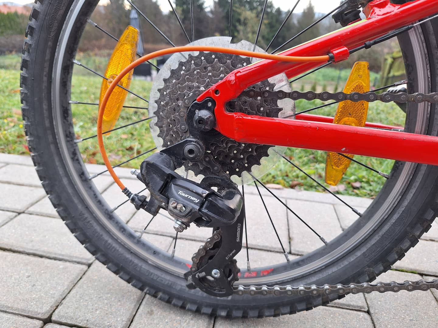 Autentyczny rower górski w wersji mini, wyposażony w hamulce tarczowe