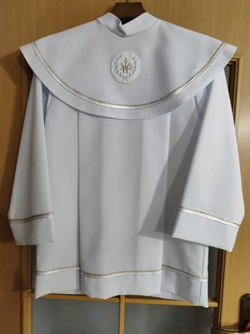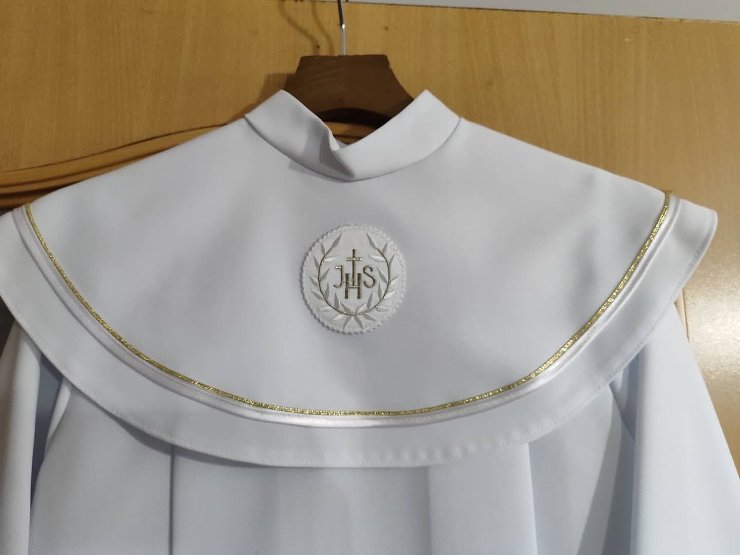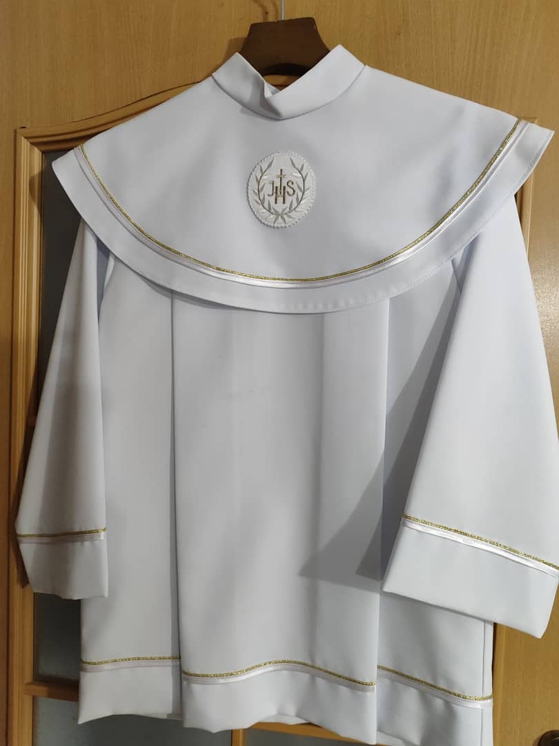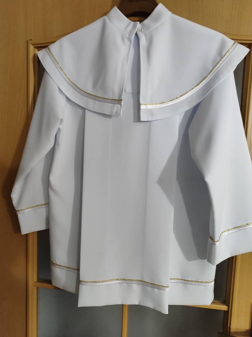 Śliczna alba, biała,delikatna, jak nowa.Wymiary: długość całkowita 65 cm, szerokość w ramionach 38 cm, długość rękawa od pachy 41 cm, długość od góry 50 cm, szerokość 49 cm.Na chłopca szczupłego.Cena 120 zł.