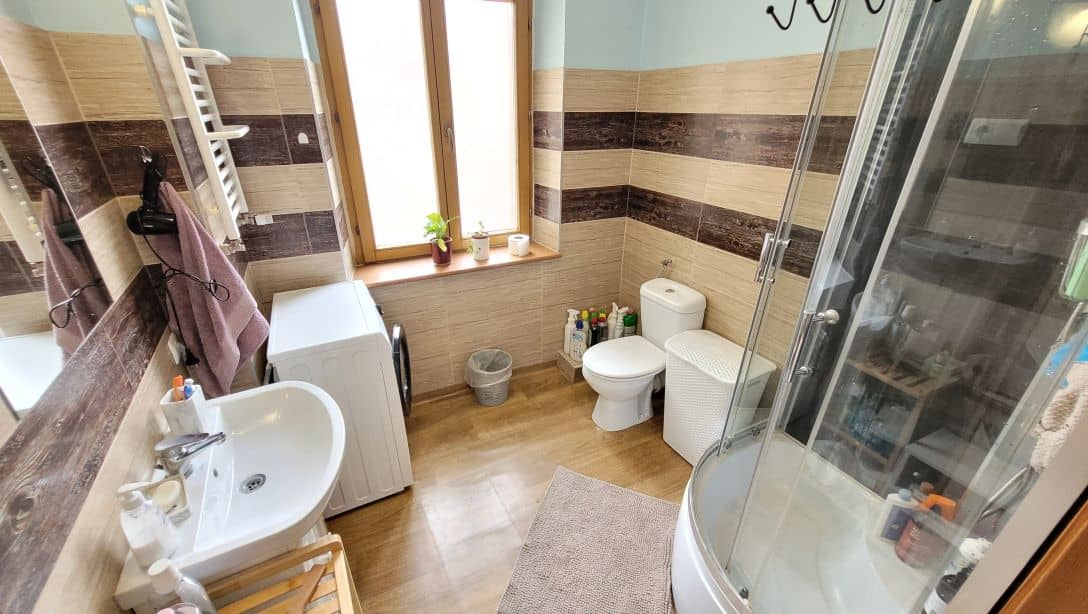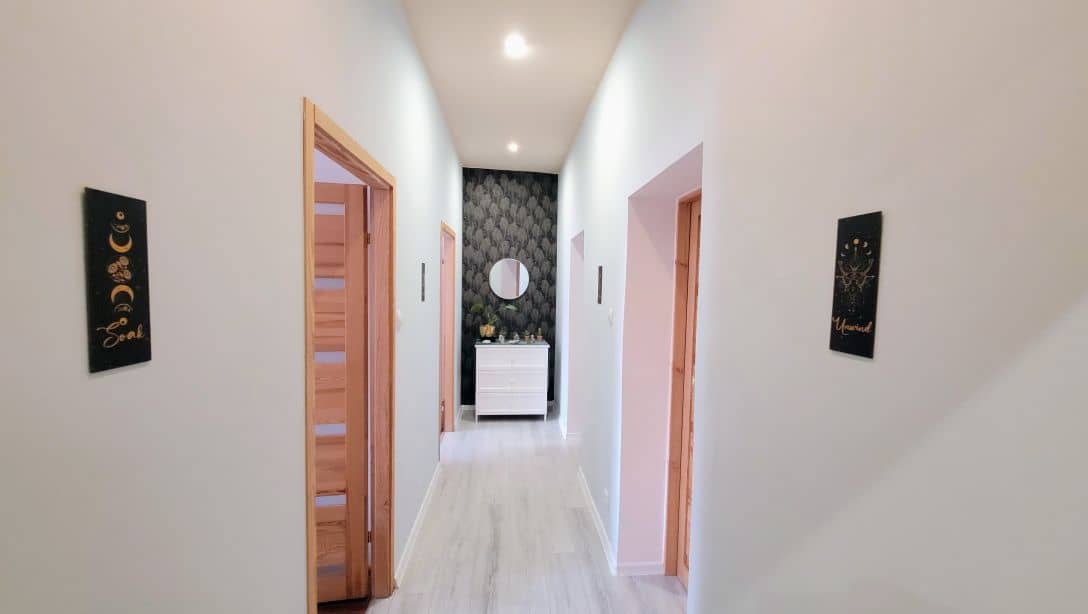 na ścianach kafle, po podłogach panele lub kafle, łazienka wykafelkowana, nowiutka zabudowa kuchenna, drewniane drzwi wewnętrze, wymieniona instalacja elektryczna, nowe drzwi wejściowe, oddzielna dodatkowa toaleta.