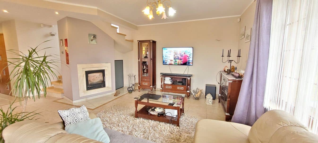Ogrzewanie na dole podłogowe, a na górze głównie koloryferowe, tylko w łazience jest mieszane, pochodzi z bardzo dobrego kominka z płaszczem wodnym o mocy 12kW oraz z pieca gazowego 2-funkcyjnego firmy Viessmann, dodatkowo ze zbiornikiem na ciepłą wodę użytkową. Kominkiem można sterować pilotem i przełączać go na np. priorytetowe grzanie wody lub wyłączenie centralnego ogrzewania i grzania tylko wody. Piec gazowy obecnie czerpie gaz ze zbiornika z gazem płynnym ale na granicy działki jest gaz ziemny, więc dość małym kosztem można go doprowadzić do budynku. Skrzynka z gazem jest zaledwie metr od instalacji gazu płynnego. Na granicy działki jest też światłowód.