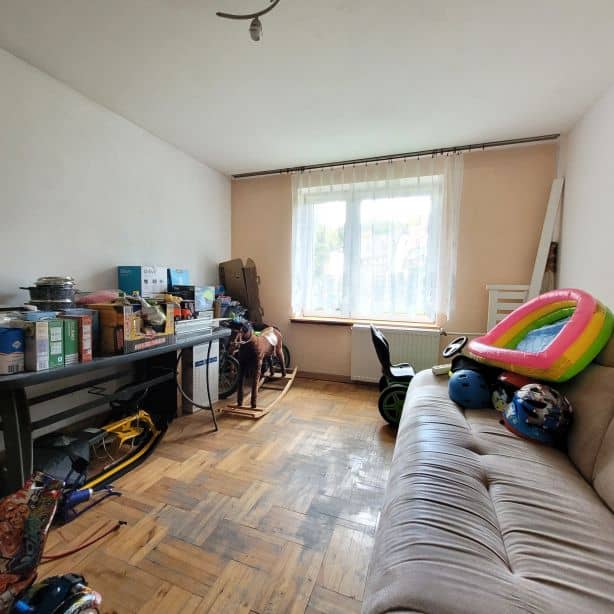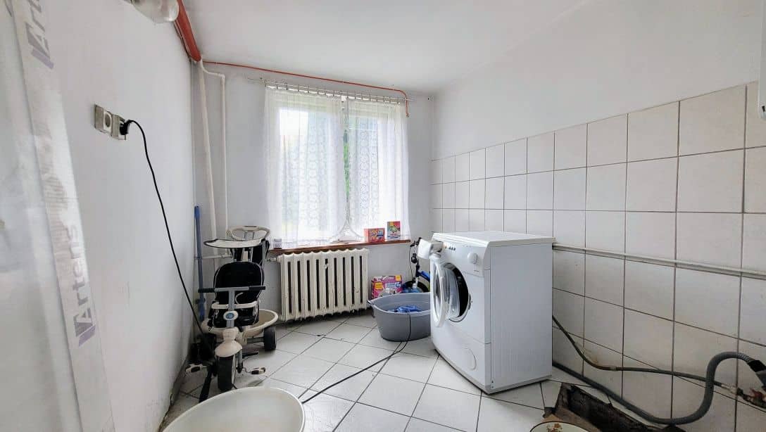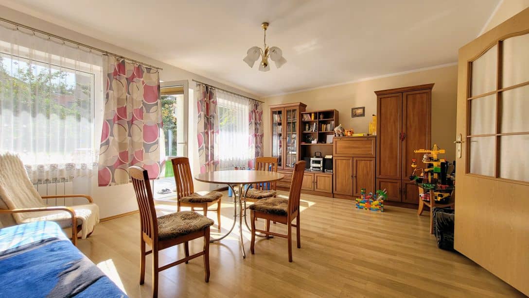 Jest to idealna nieruchomość dla rodziny, która potrzebuje więcej pomieszczeń lub dla kogoś kto chciałby w nim zamieszkać a na części z kondygnacji zrobić pokoje lub mieszkanka pod wynajem. Ilość pokoi jest podana orientacyjnie, bo nowy właściciel może dowolnie zagospodarować pomieszczenia w których np. znajdowały się kuchnie lub też pomieszczenia w przyziemiu. W domu można spokojnie zamieszkać na parterze, na którym znajduje się salon z wyjściem na taras i do ogrodu, sypialnia, kuchnia, łazienka z wanną, toaleta oraz przedpokój. Na tym poziomie okna zostały wymienione na plastikowe, ciepła woda pozyskiwana jest z junkersa gazowego, a centralne ogrzewanie jest z pieca w przyziemiu na paliwo stałe. Ta część nieruchomości jest zadbana i w dobrym stanie, więc można w niej od razu zamieszkać i powoli remontować resztę pomieszczeń.