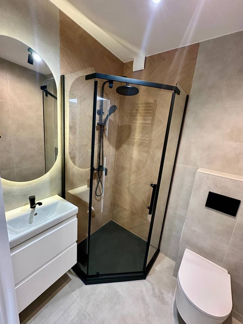 -kuchnia wyposażona w sprzęty AGD w zabudowie meblowej (zmywarka, okap, płyta gazowa, lodówka, zmywarka, piekarnik, pralka).