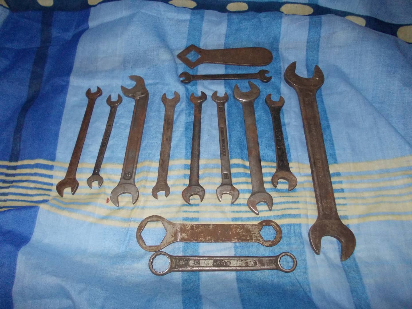 Sprzedam zestaw kluczy płaskich. W zestawie klucz płaski 1x27/25, 1x14/12, 1x16, 1x11/9, 3x12/10, 2x9/8, 2x17/14 w tym jeden oczkowy oraz dwa klucze do roweru/motoru które nie maja żadnych oznaczeń.Posiadają ślady użytkowania, naloty rdzy. 25 zł