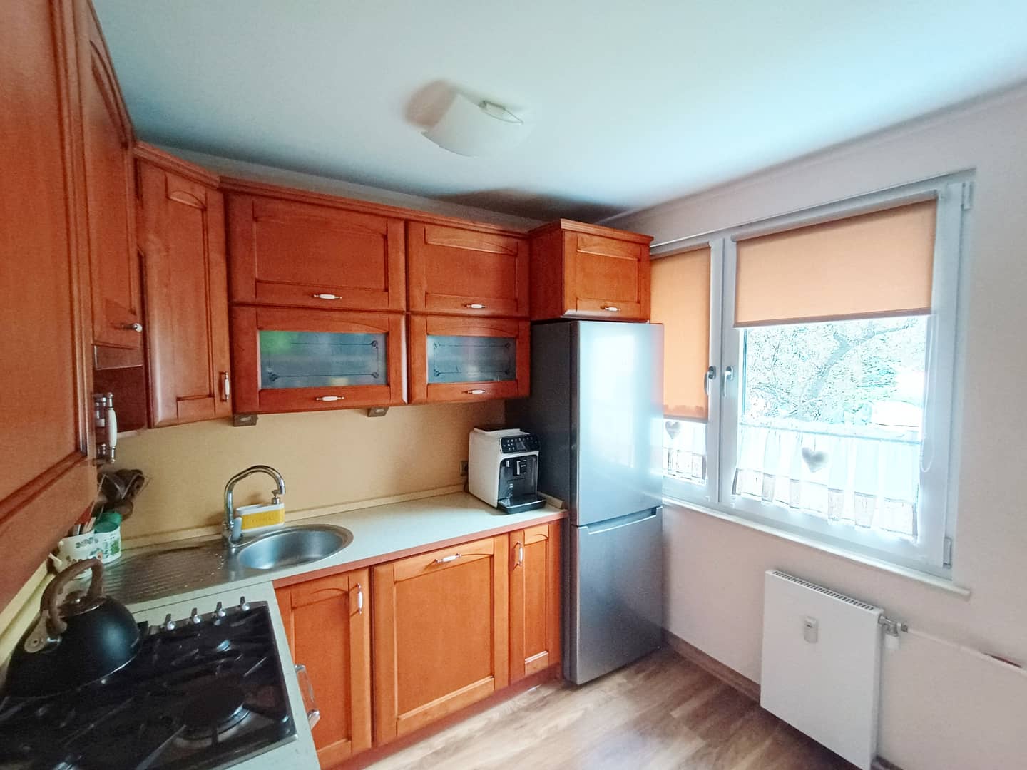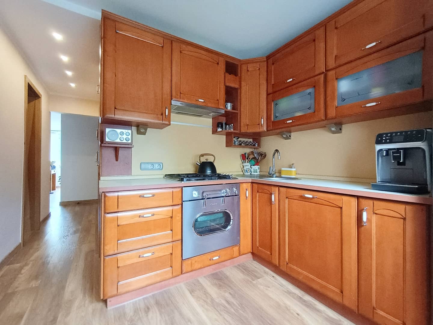 Kuchnia w zabudowie (fronty z litego drewna), drzwi wewnętrzne drewniane.