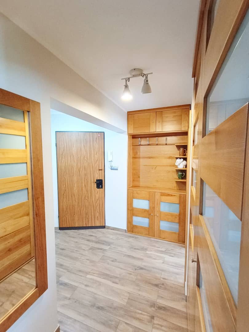 Mieszkanie, z uwagi na wyburzenie części ścianki między salonem a przedpokojem, jest bardzo przestronne. Dodatkowy atut stanowi pojemna garderoba, w której wygospodarowano zarówno miejsce na rzeczy gospodarcze, jak i odzież.