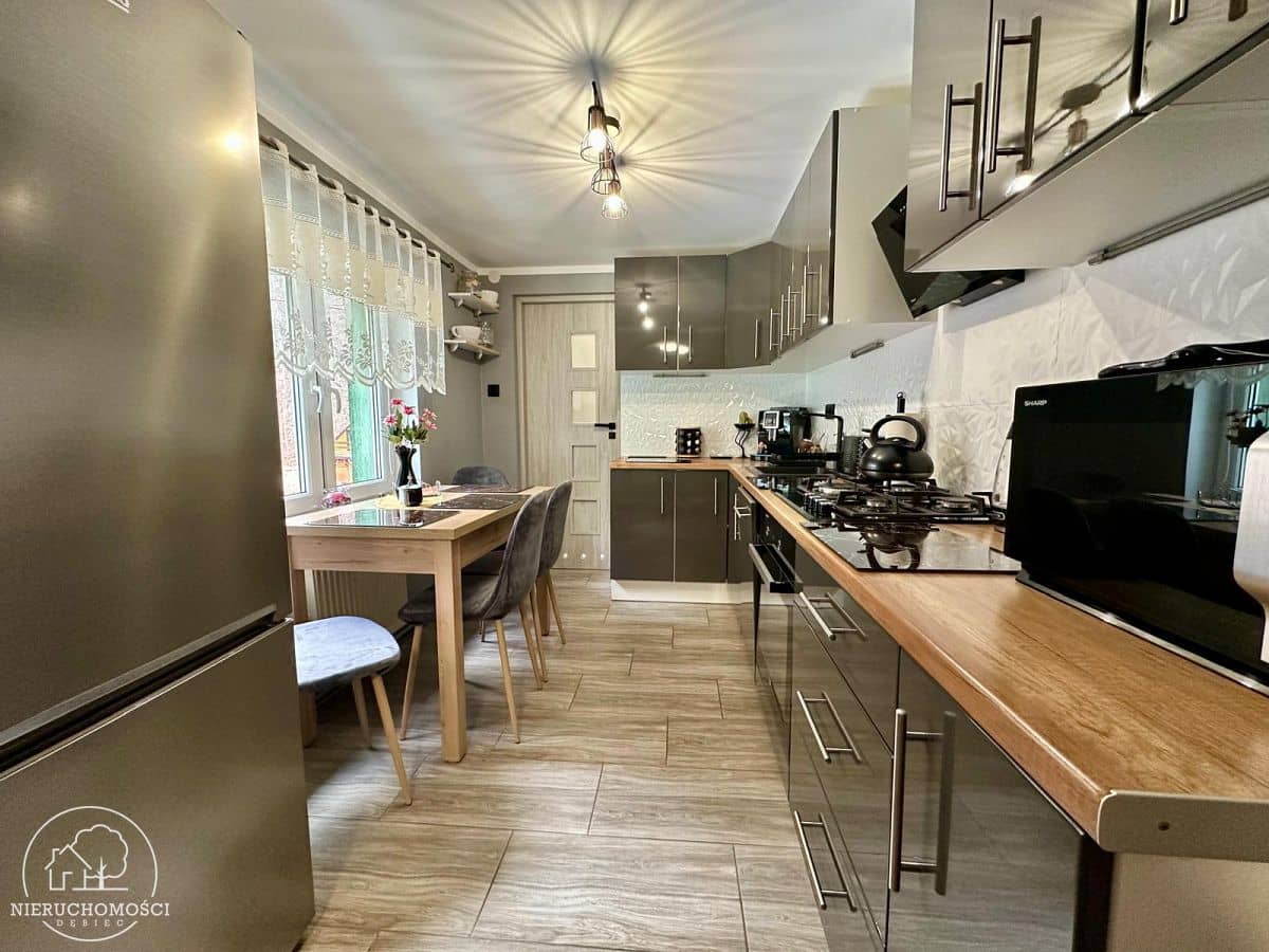 W kuchni nowa zabudowa meblowa wykonana na wymiar oraz wysokiej jakości sprzęty AGD..