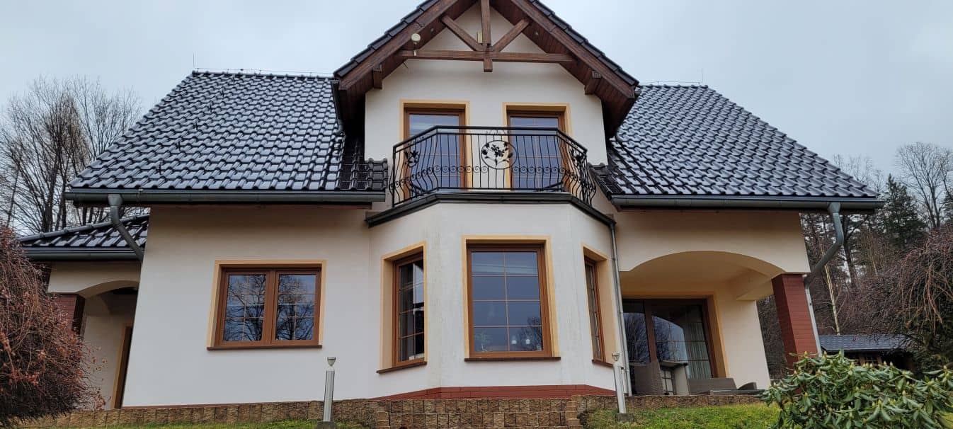 Ściany zewnętrzne są z ytoungu 24cm i docieplone są 15cm styropianu a dach wełną mineralną. Na dachu jest matowa dachówka ceramiczna, okna plastikowe w kolorze drewna 2-szybowe antywłamaniowe P2, parapety wewnętrzne i zewnętrzne granitowe, wokół budynku jest zrobiony drenaż.