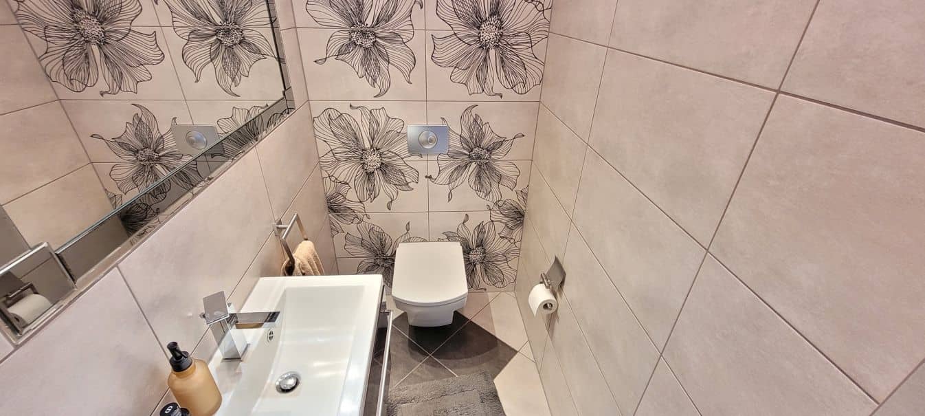 Dom oczywiście wolnostojący stoi na szczycie prowadzących do niego wykostkowanych schodów. Ma powierzchnię 112m2 i nie wymaga dodatkowych nakładów finansowych. Do tego jest tani w utrzymania ponieważ ma własną studnię i bezobsługową przydomową oczyszczalnię ścieków.