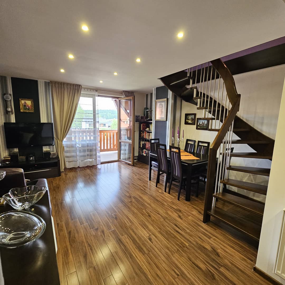 • przestronny salon z aneksem kuchennym i jadalnią oraz wyjściem na balkon z pięknym widokiem na góry,