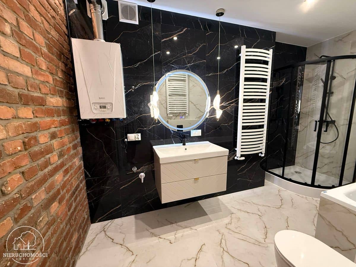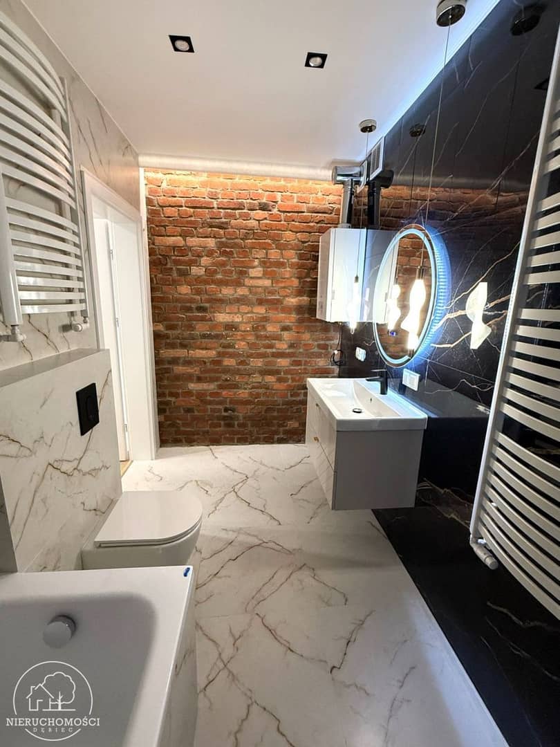 W salonie oraz łazience wyeksponowane ściany z oryginalnej cegły, co nadaję wnętrzu charakteru.