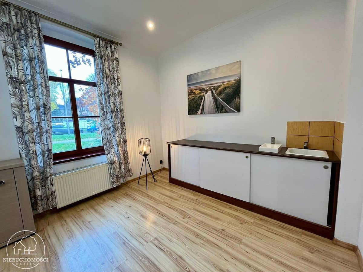 Na podłogach panele oraz kafle, okna nowe drewniane. Lokal bardzo słoneczny, jasny i przestronny.