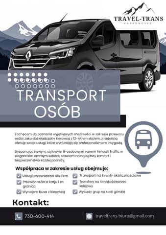 Planujecie Ostatki w większym gronie? Zapomnij o dylemacie „kto kieruje”. Oferuję bezpieczny i komfortowy transport nowym busem Renault Trafic (8 pasażerów + kierowca).