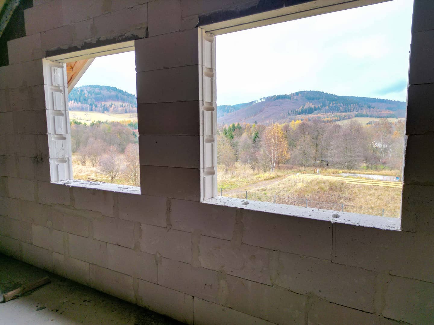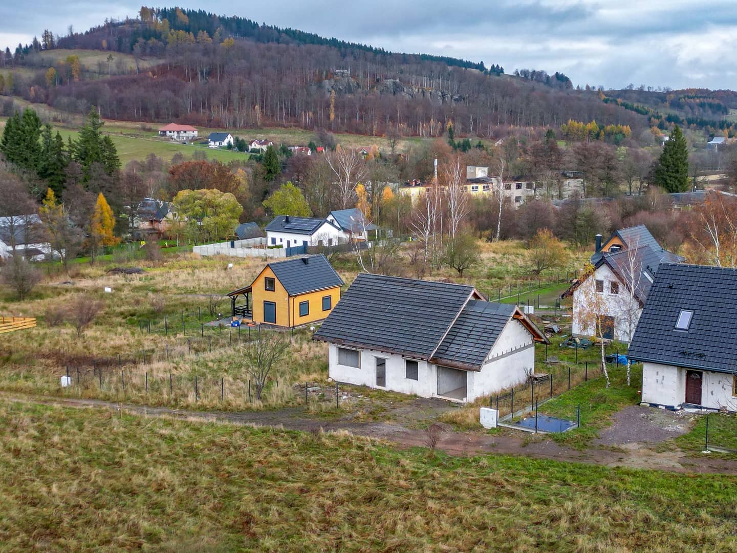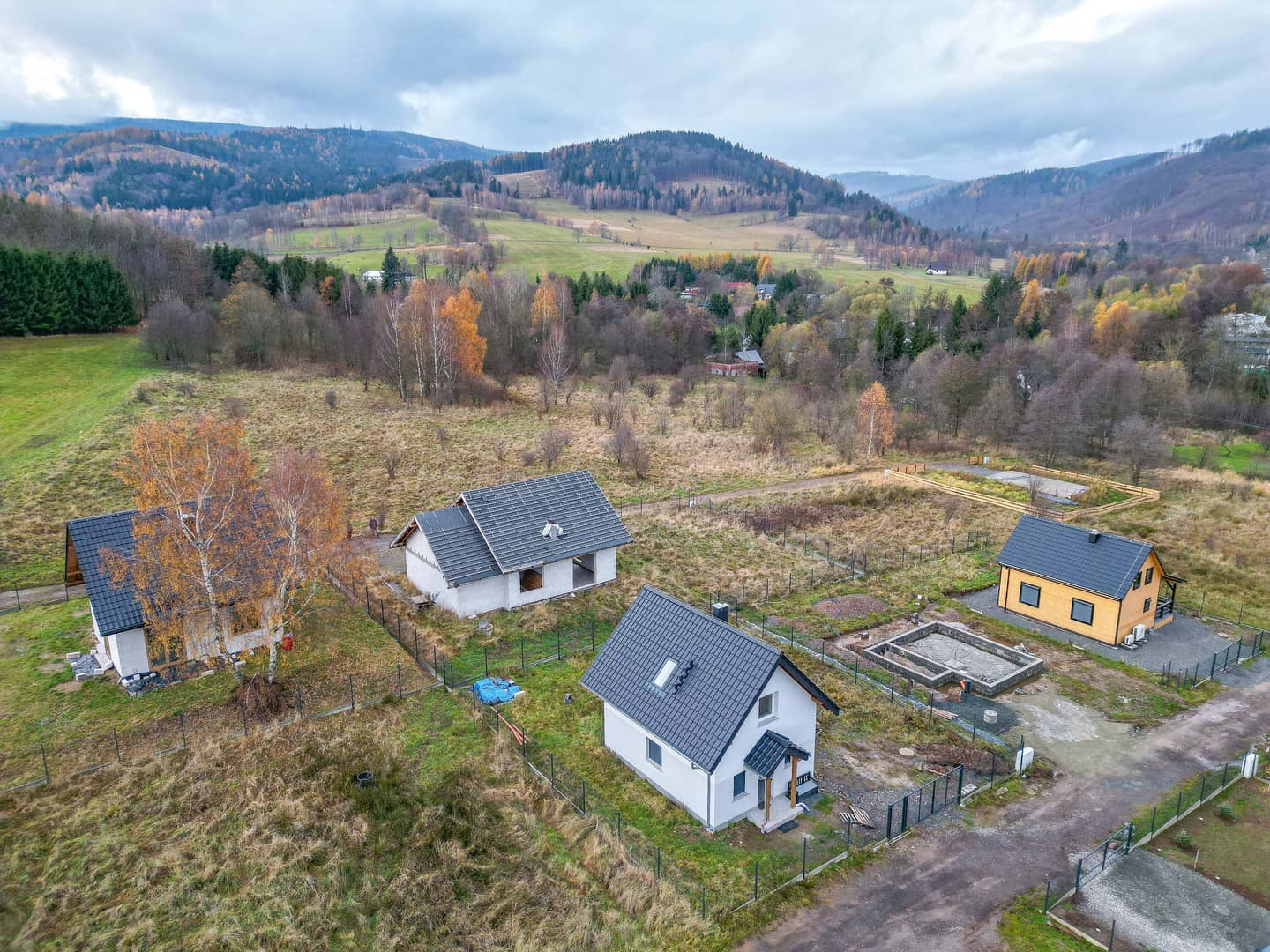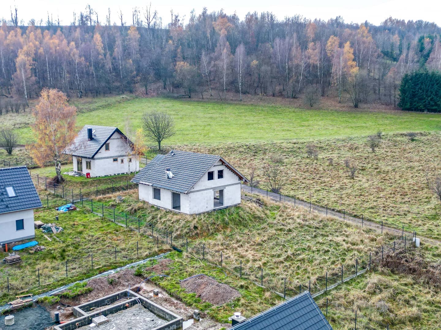 Inwestycja budowana na podstawie pozwolenia na budowę z 2023 roku. Lokalizacja zapewnia spokój, otwartą przestrzeń i widok na góry – po drugiej stronie drogi gminnej znajduje się działka rolna, co gwarantuje brak bezpośredniej zabudowy przed posesją.