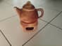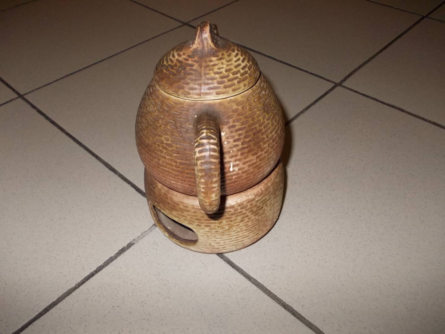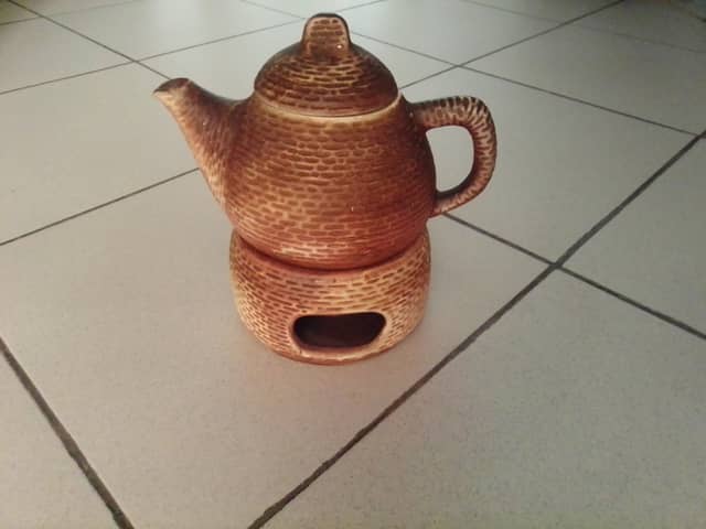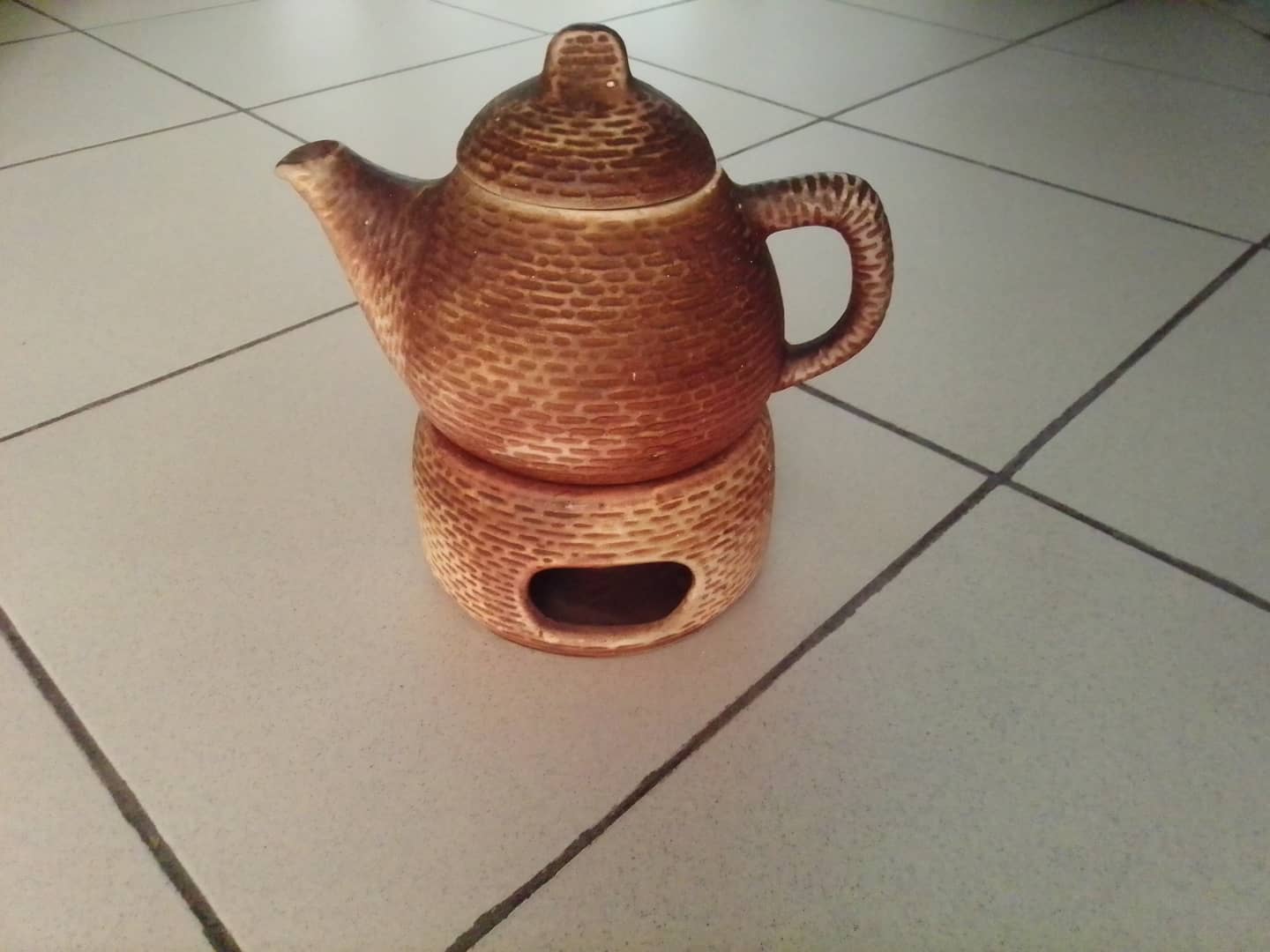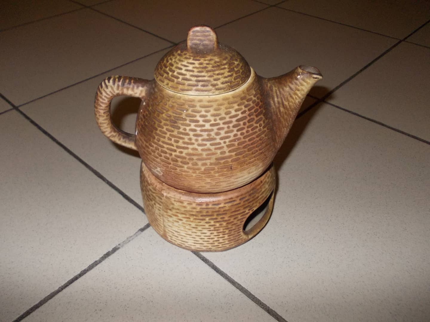 Ceramiczny imbryk z podgrzewaczem. Posiada charakterystyczny tłoczony wzór przypominający cegiełki. Niewielkie ślady od przechowywania. 30 zł.