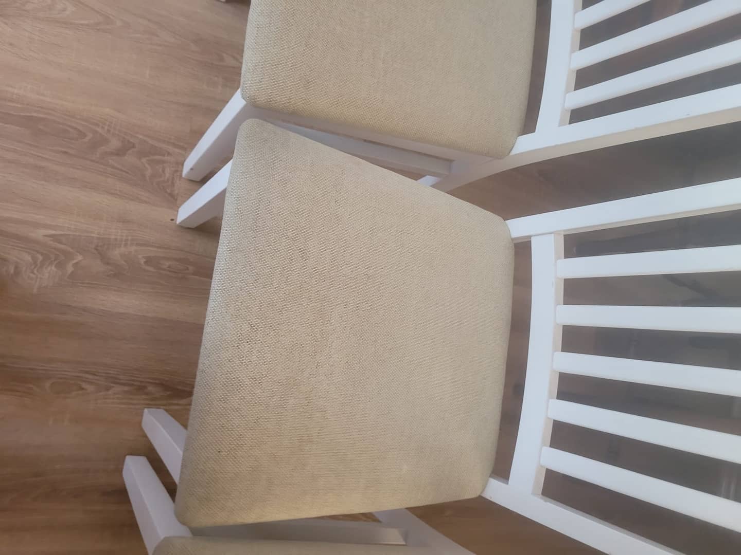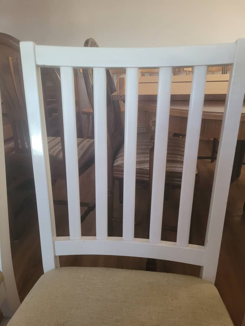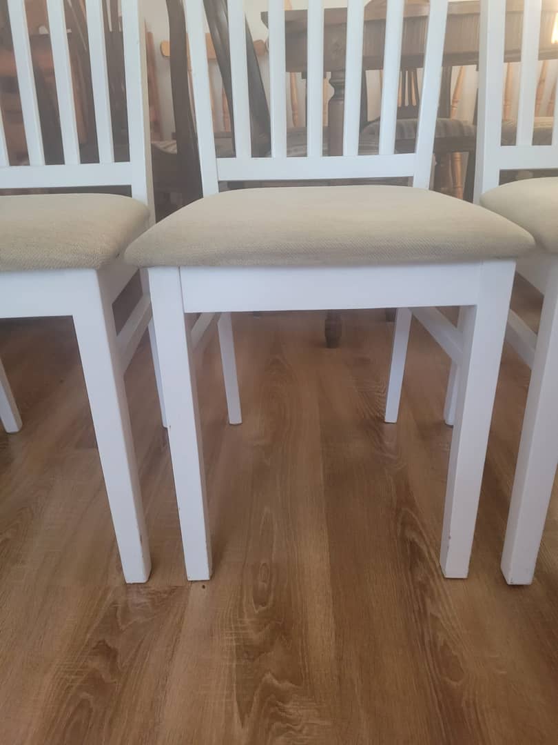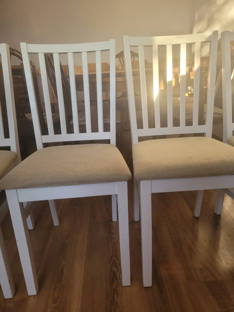 Cztery białe drewniane krzesła w bardzo dobrym stanie. Wygodne i nie rozchwiane, możliwy transport. Cena 450 zł.