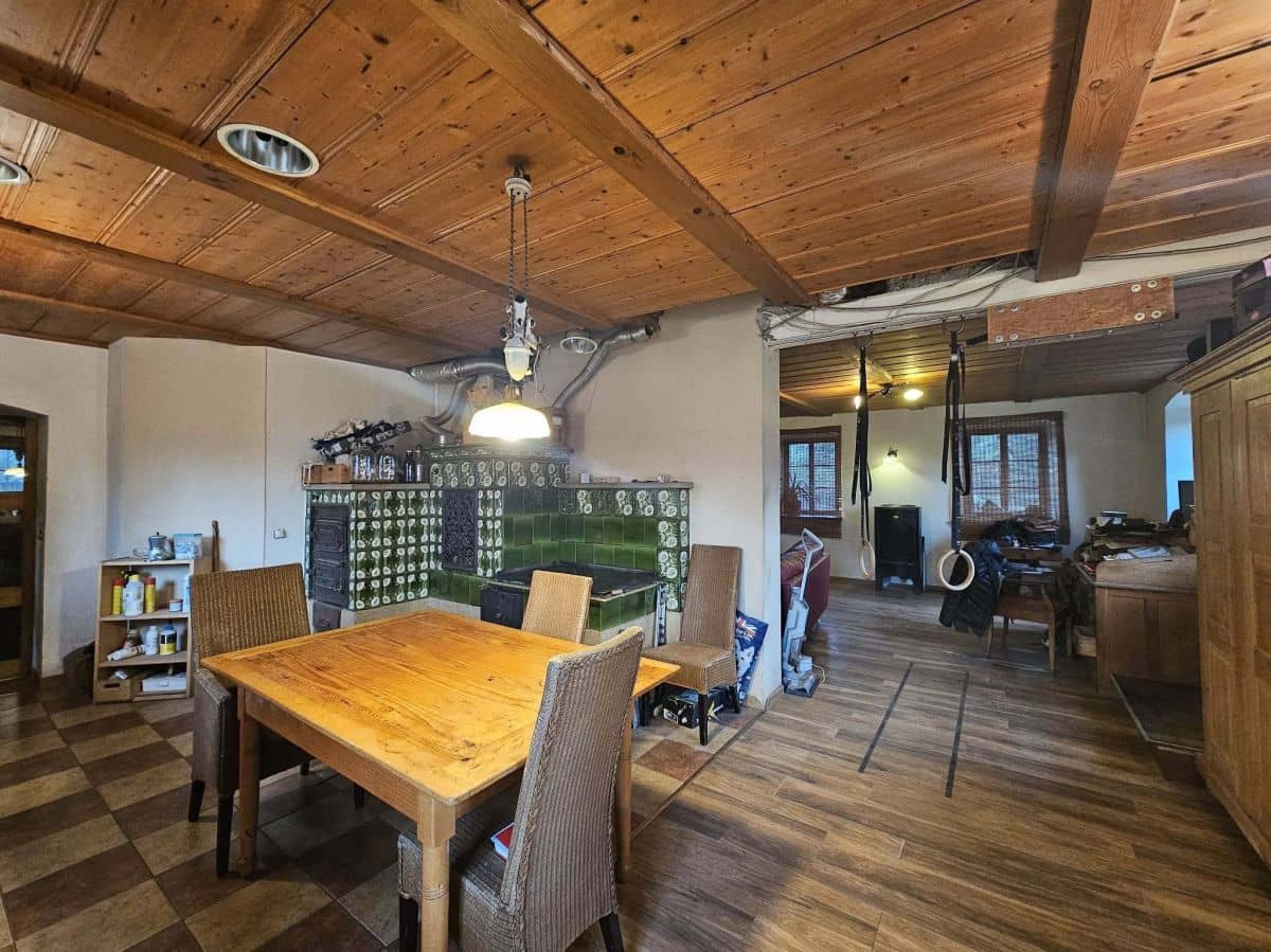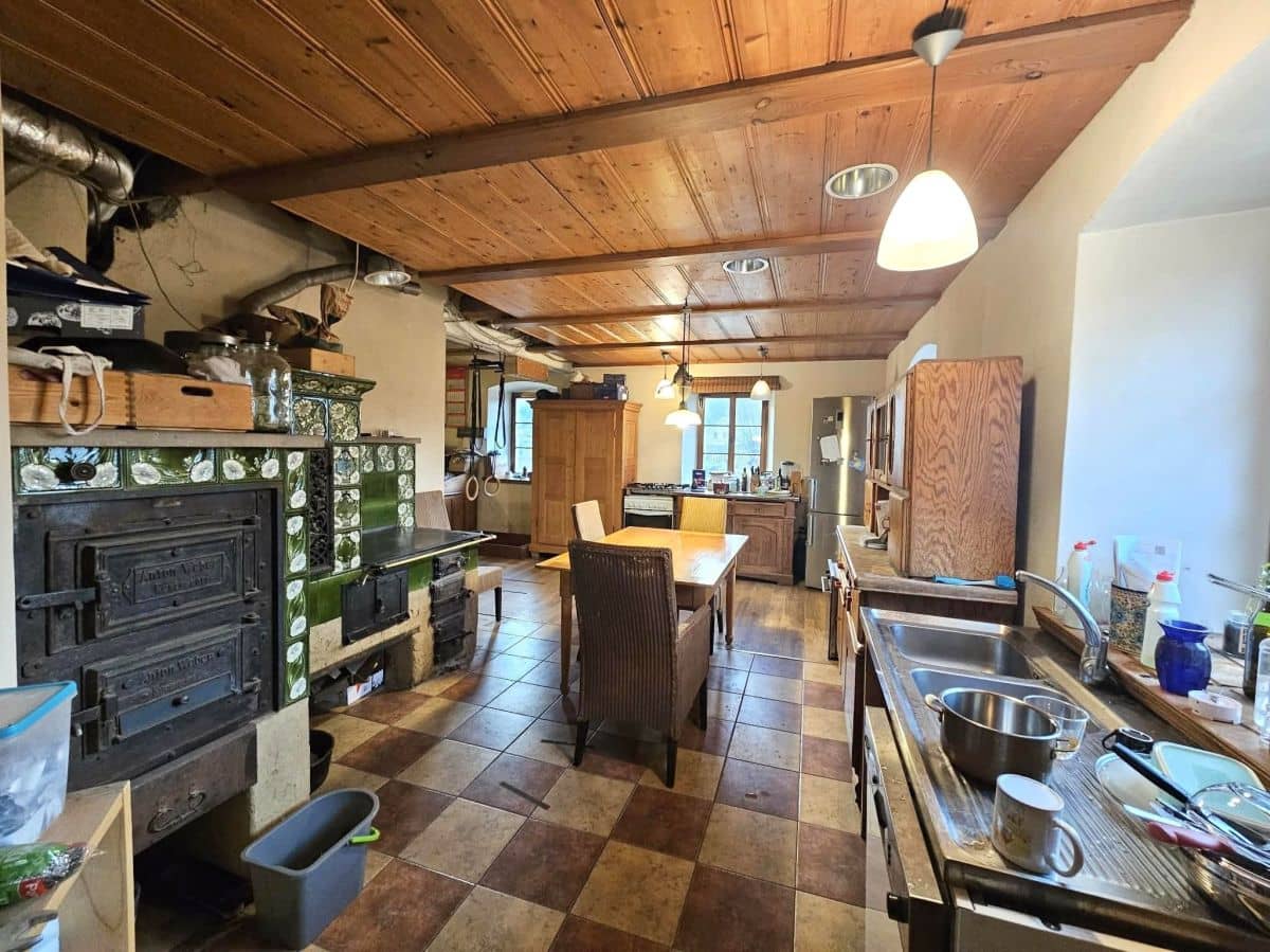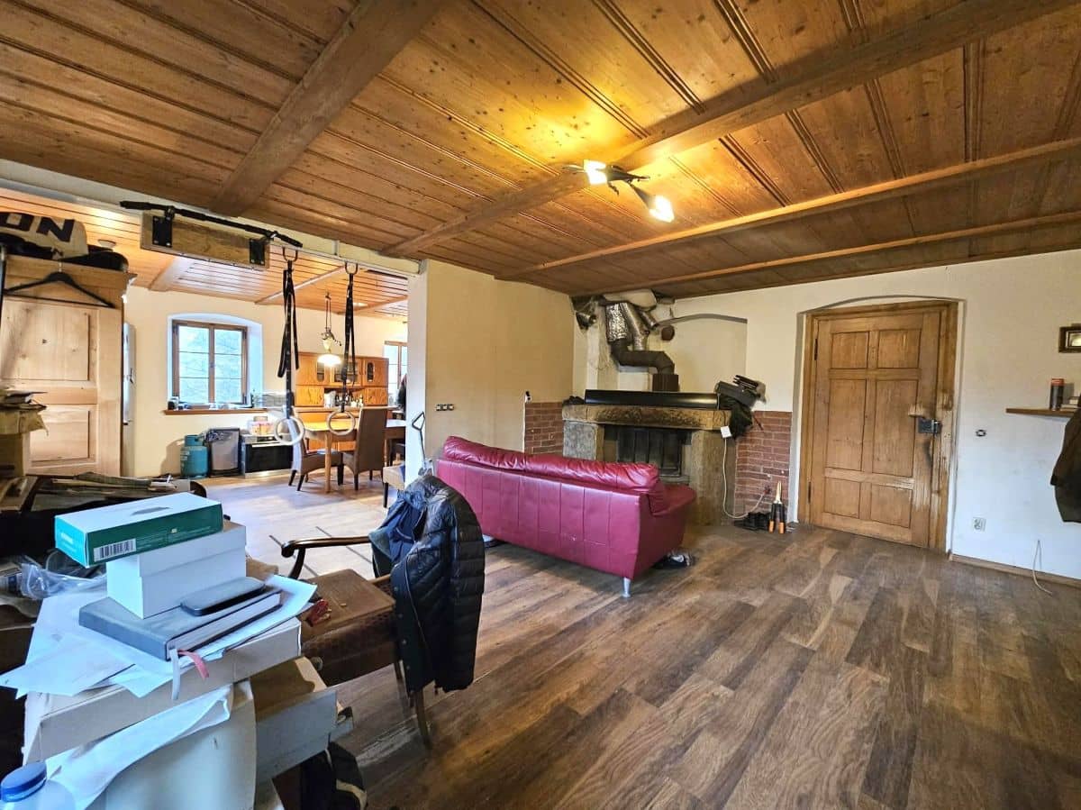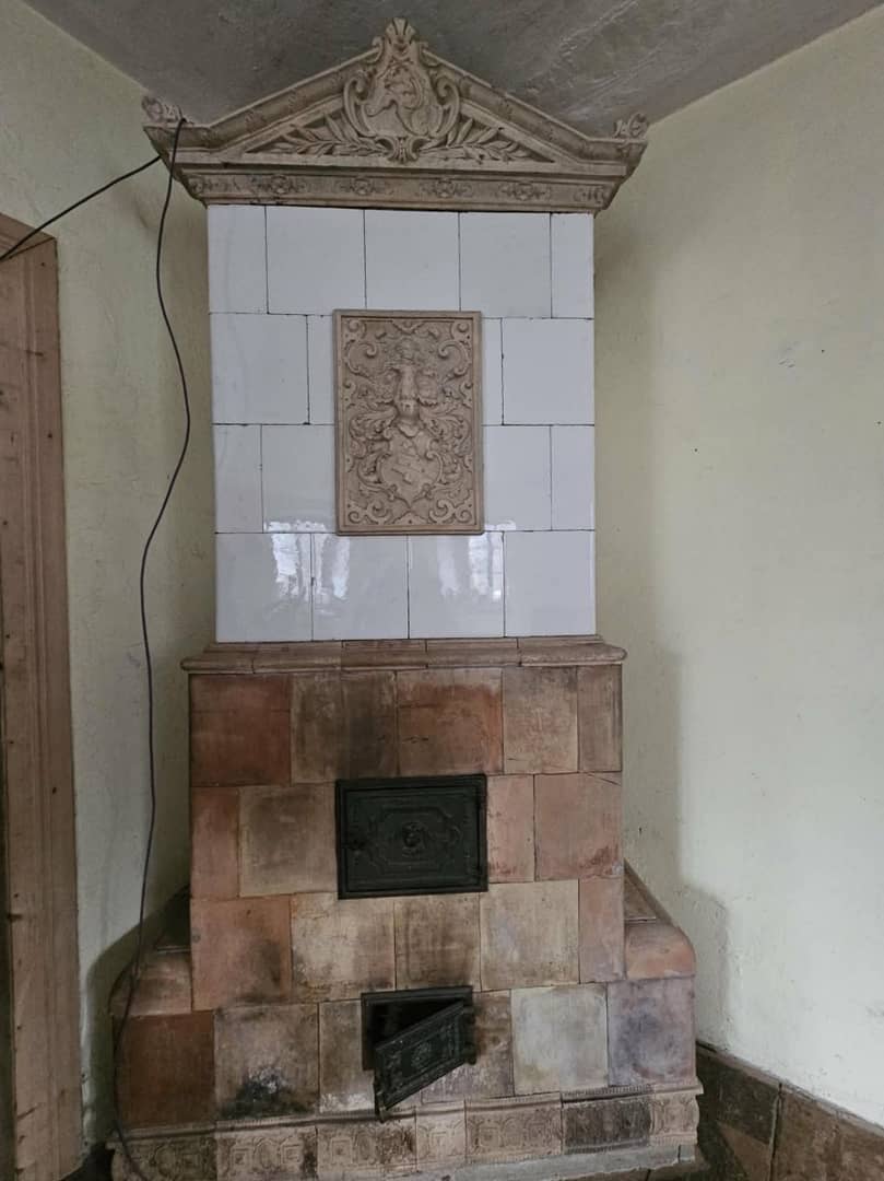 - salon połączony z kuchnią w której jest stary kuchenny piec