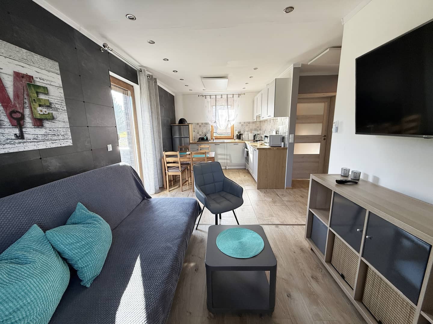 - pokój dzienny z aneksem kuchennym i wyjściem na taras;