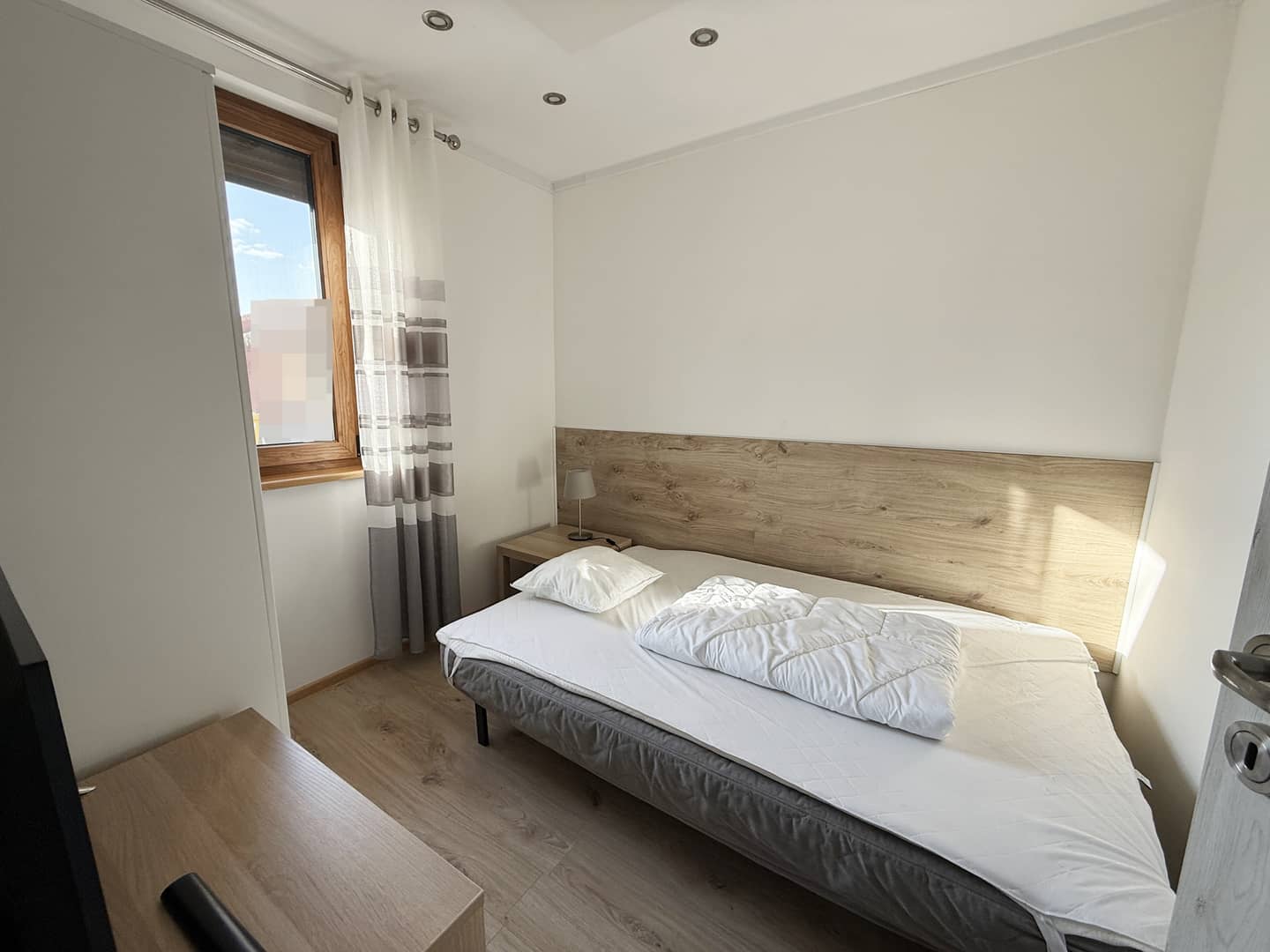 Okna PCV z zewnętrznymi roletami, na podłogach panele i kafle.
