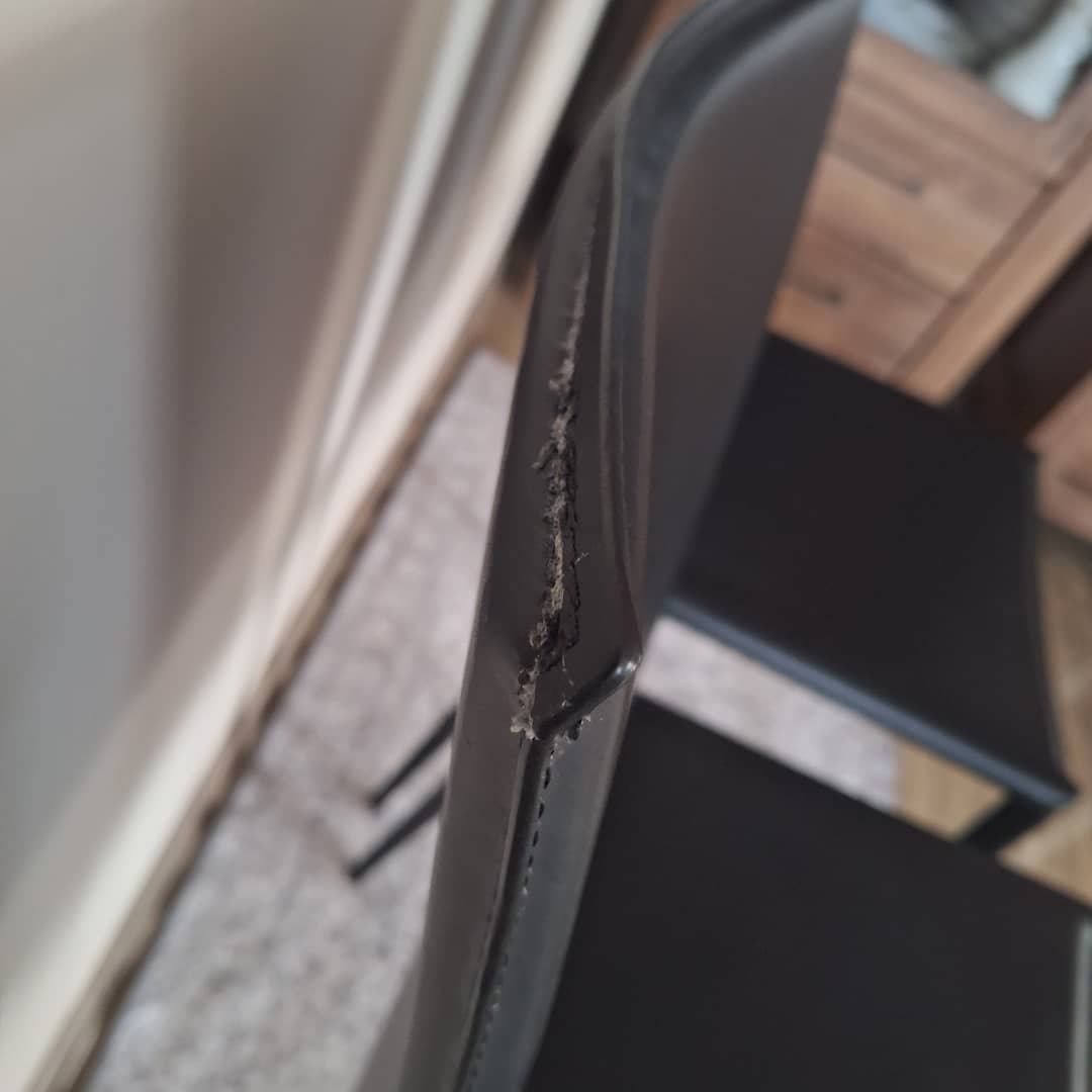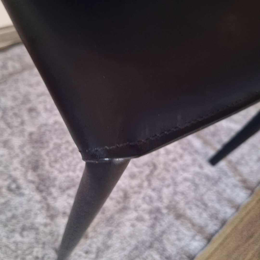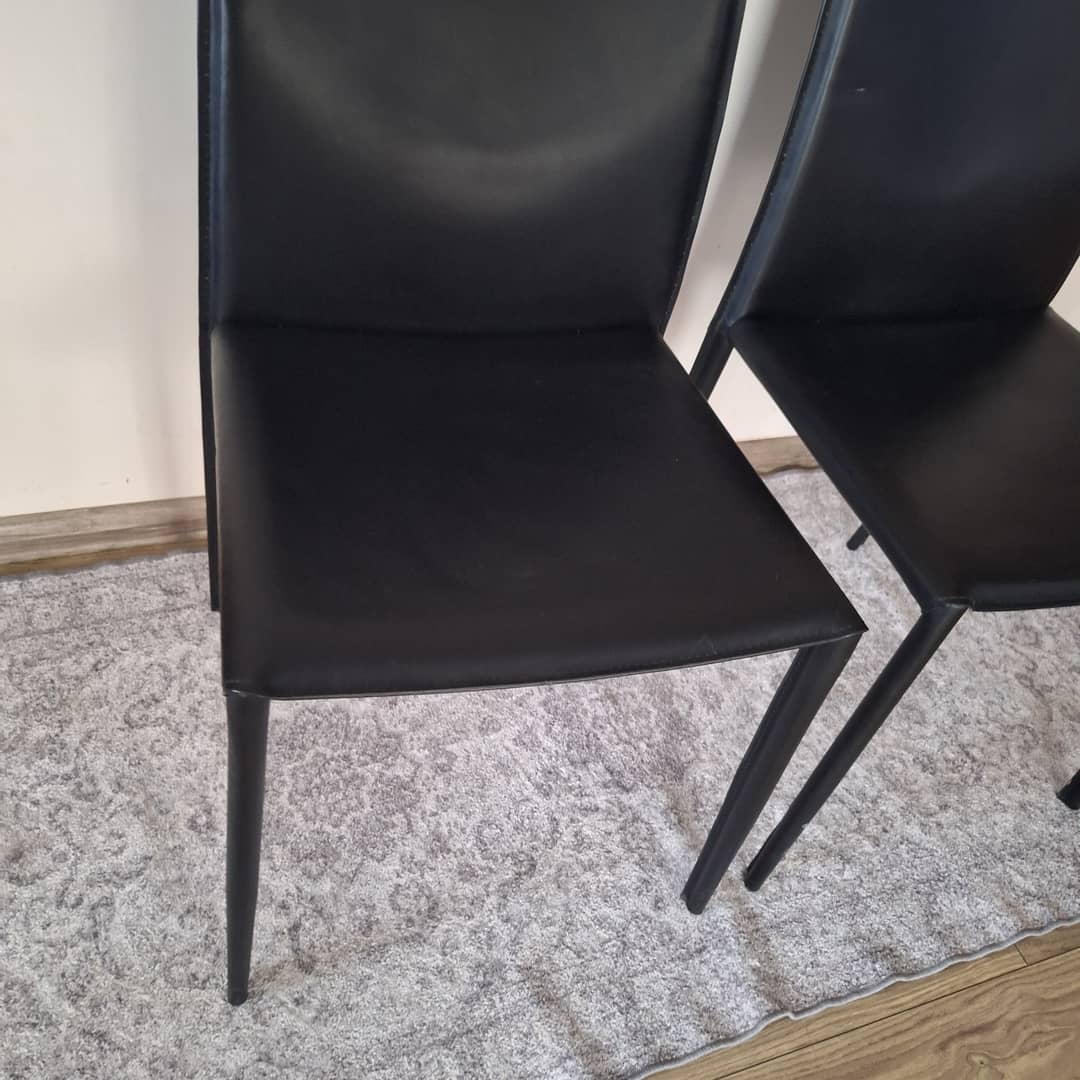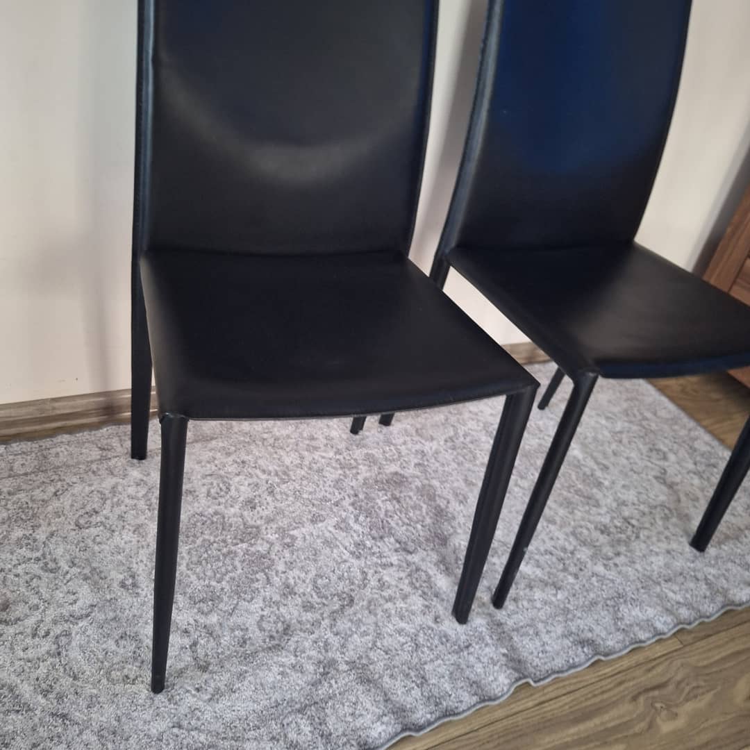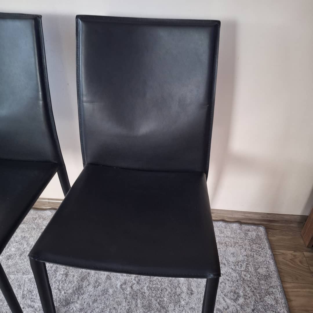 Dwa czarne,krzesła w nowoczesnym stylu. Solidna konstrukcja i wygodne siedziska. Niewielkie ślady użytkowania widoczne na zdjęciach. Cena za komplet 100 zł. Możliwy transport.