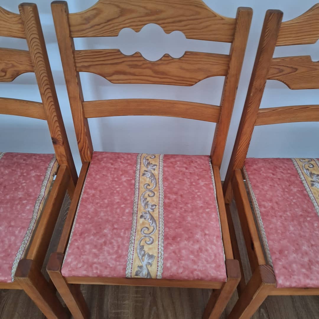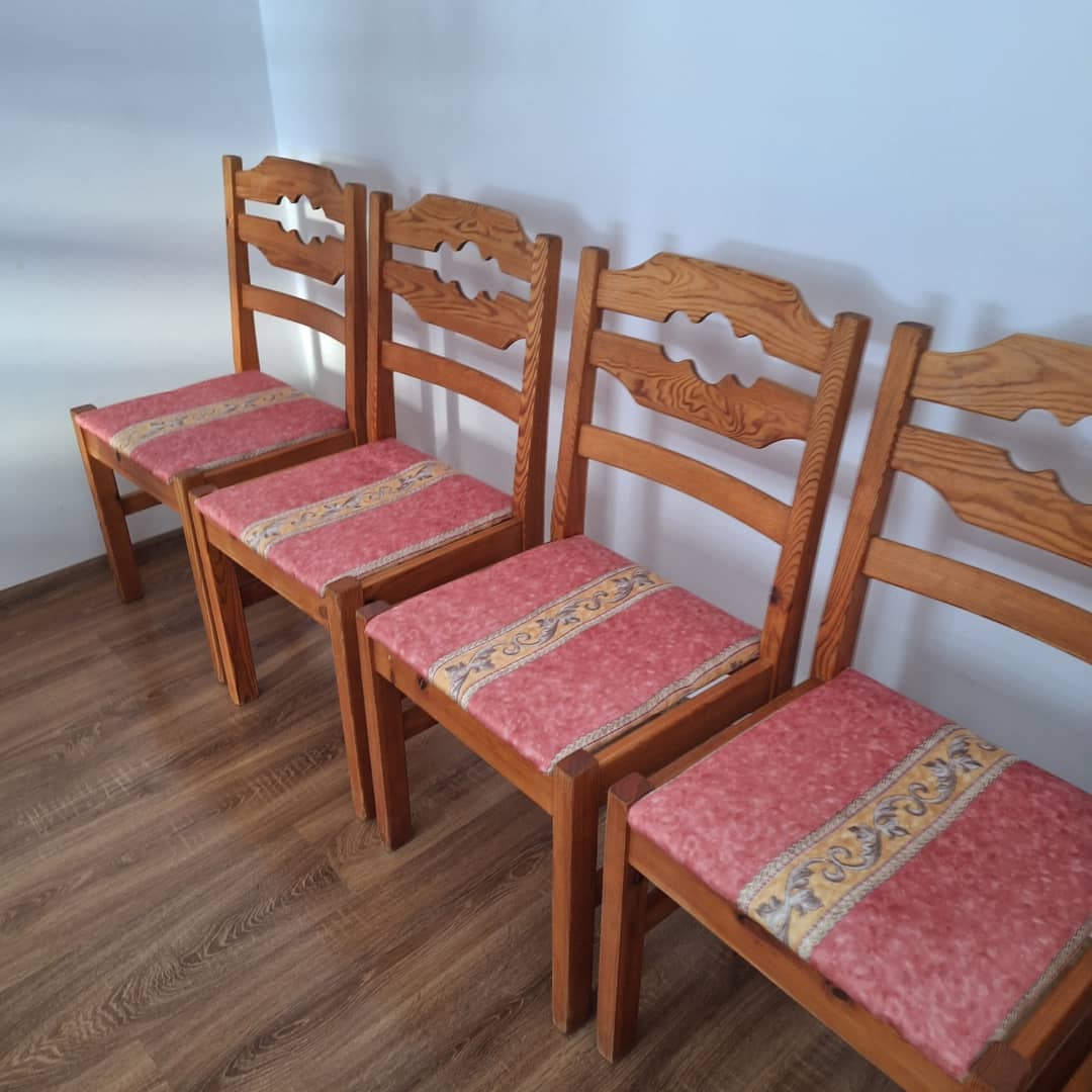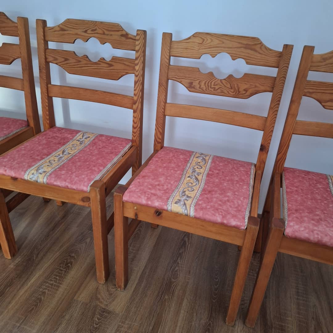 Krzesła drewniane z obiciem, w dobrym stanie, nie rozchwiane, 6 sztuk. Cena za 6 sztuk 360 zł.