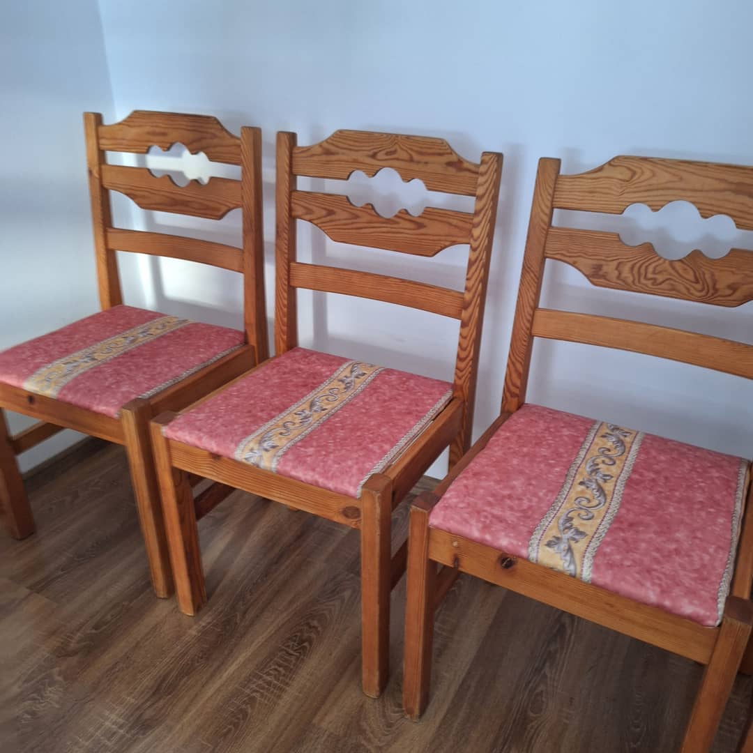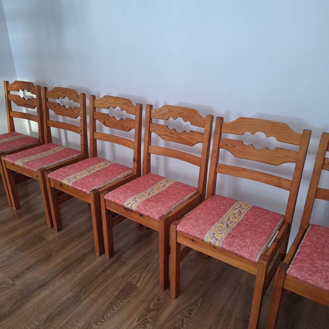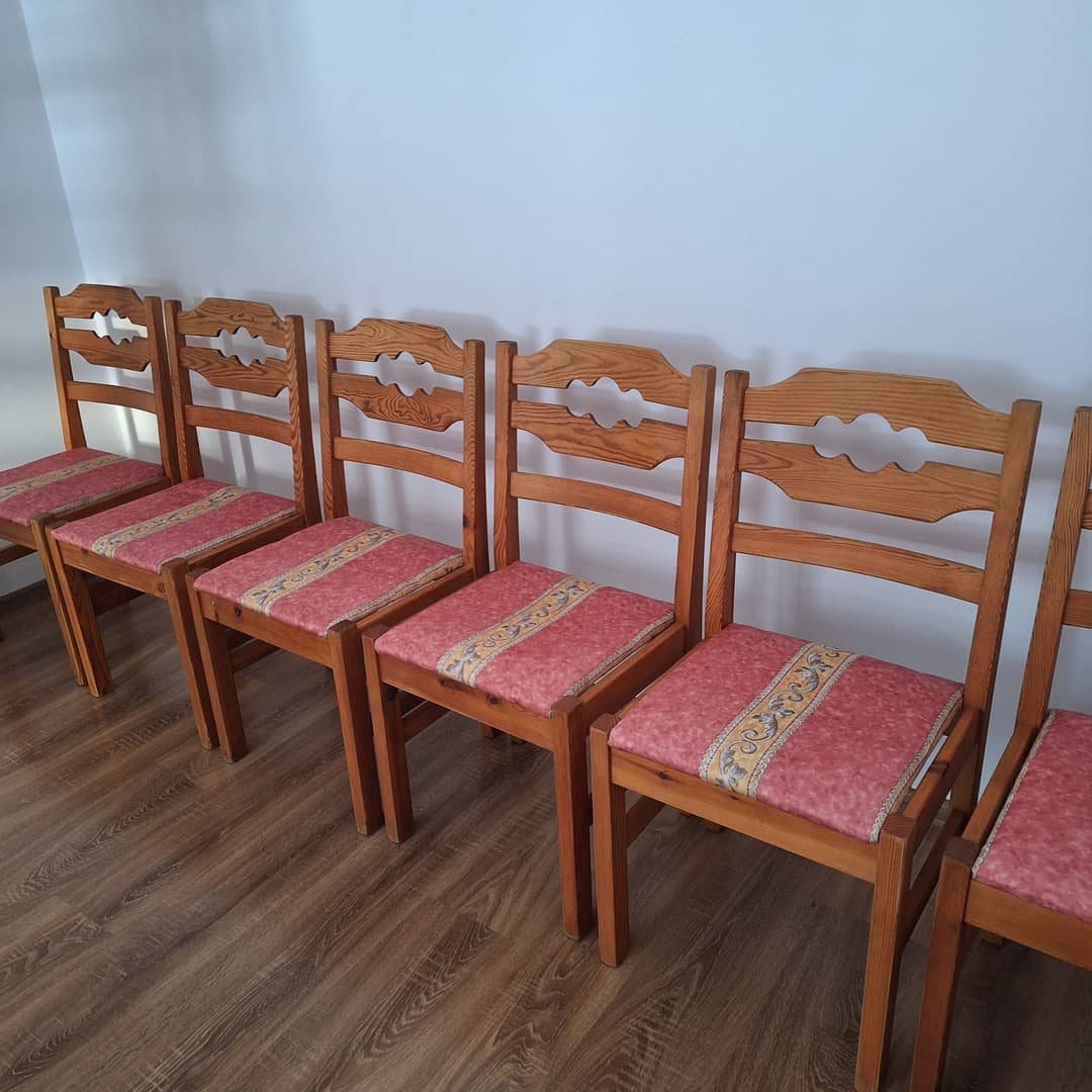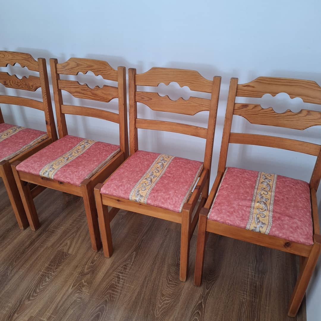 Krzesła drewniane z obiciem, w dobrym stanie, nie rozchwiane, 6 sztuk. Cena za 6 sztuk 360 zł.