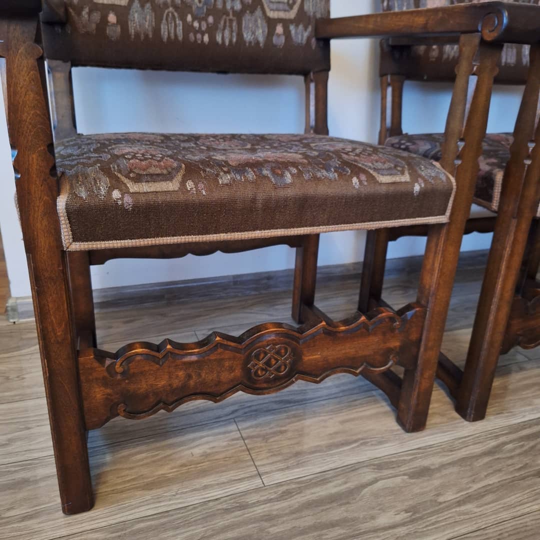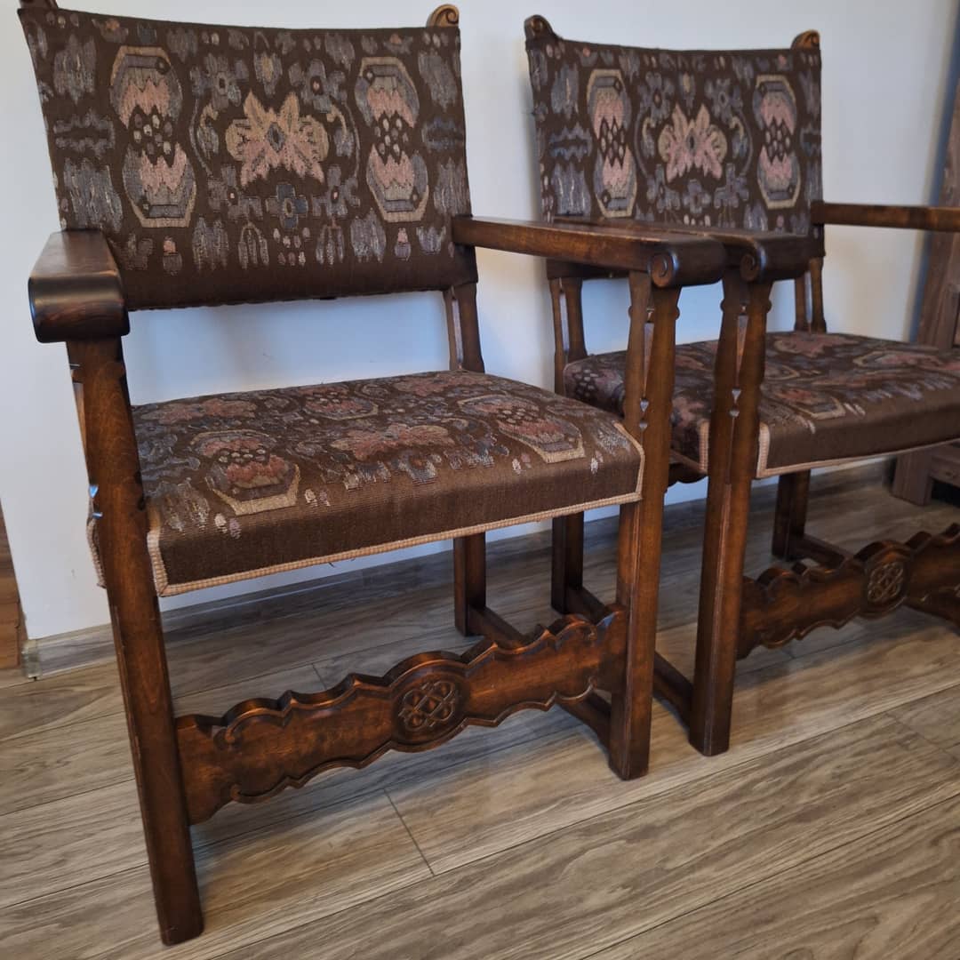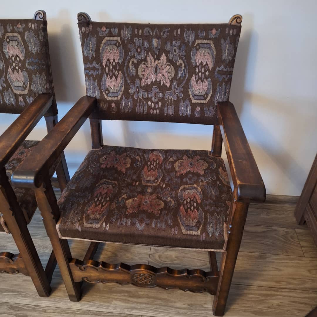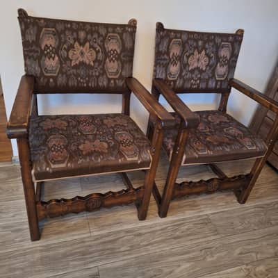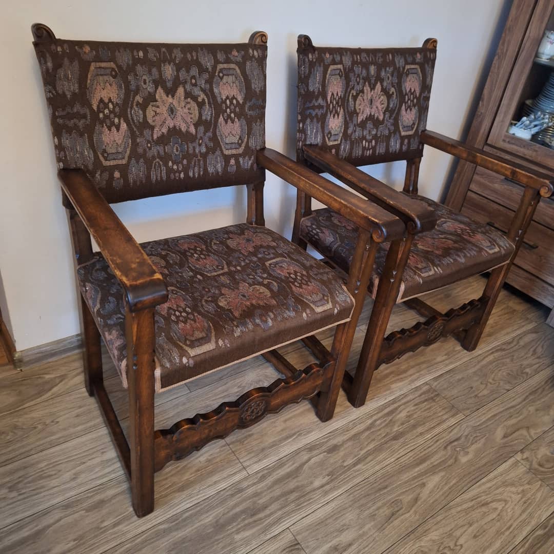 Dwa stylowe dębowe krzesła, rzeźbione, w dobrym stanie bez uszczerbień w drewnie, bez plam na tapicerce . Krzesła te są trwałe i wytrzymałe. Możliwy transport lub odbiór osobisty. Cena za dwa 350 zł.