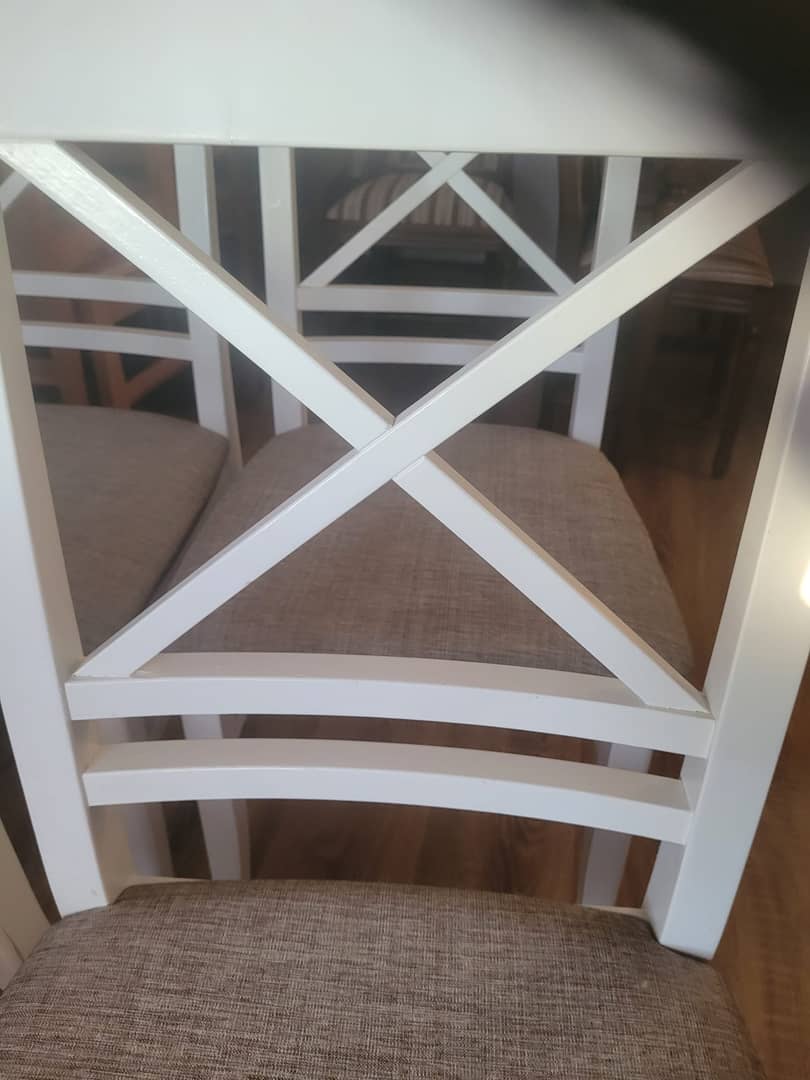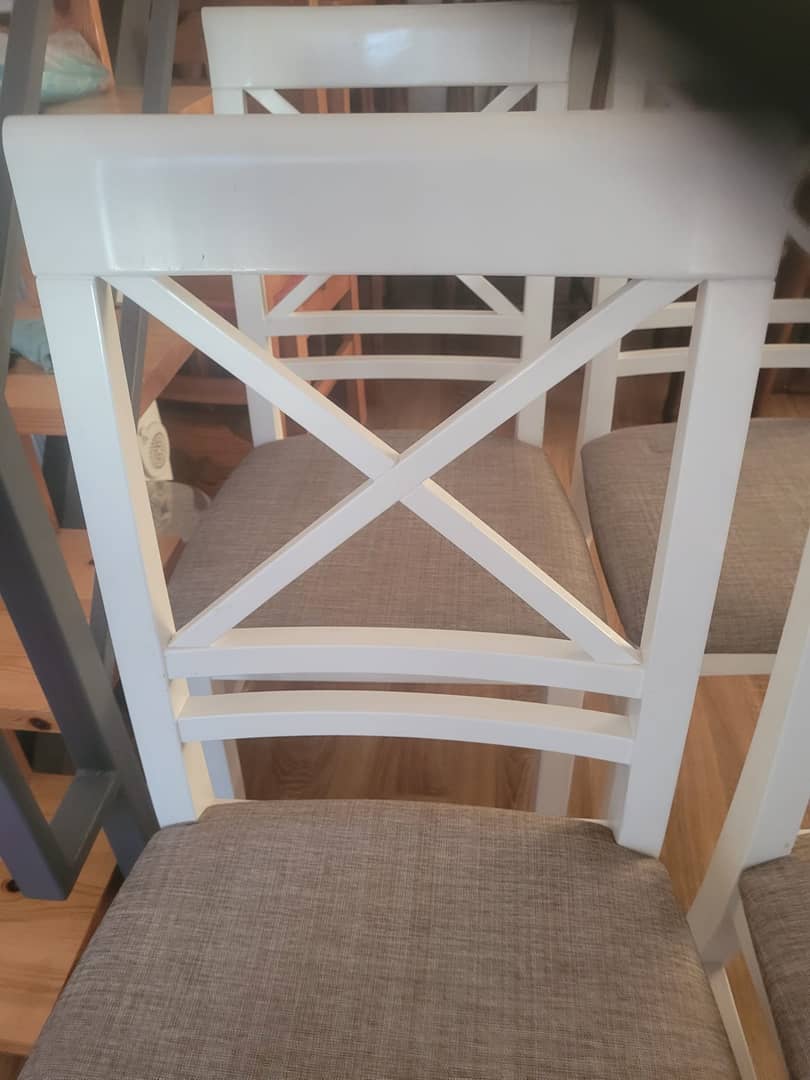Cztery białe drewniane krzesła krzyżykowe w bardzo dobrym stanie. Wygodne i nie rozchwiane, możliwy transport. Cena 450 zł.