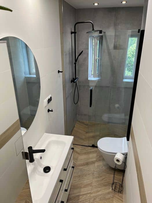 Na podłogach znajdują się panele oraz kafle, a okna PCV z podwójnymi szybami zapewniają dobrą izolację i niższe koszty ogrzewania.