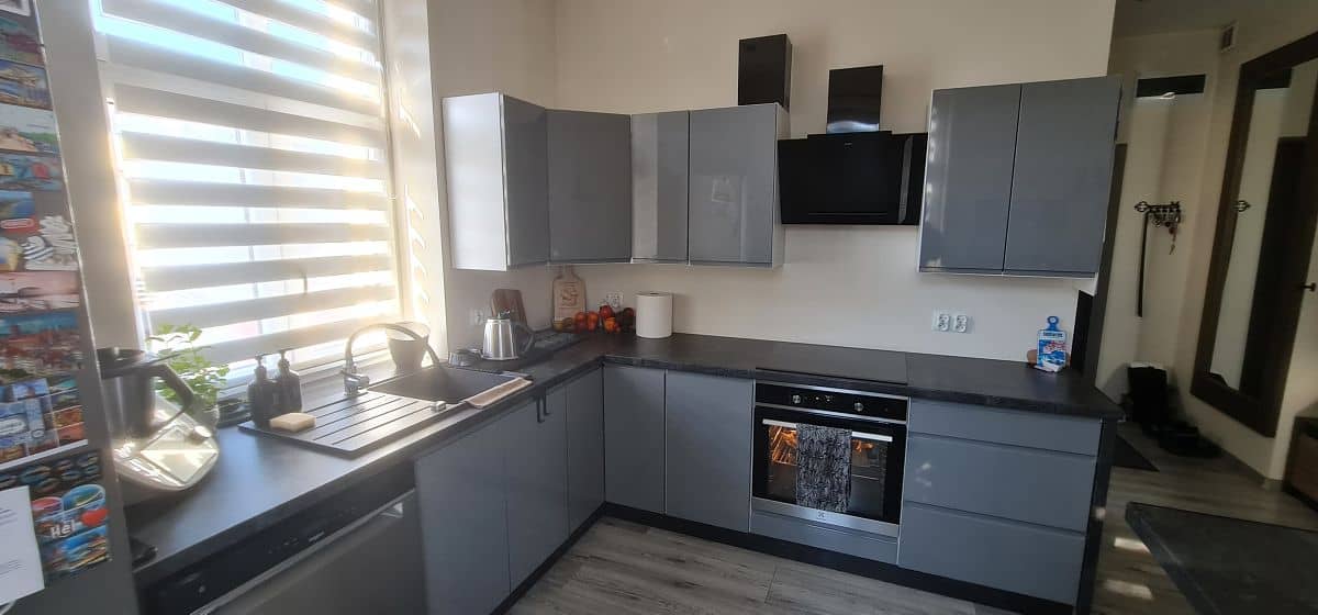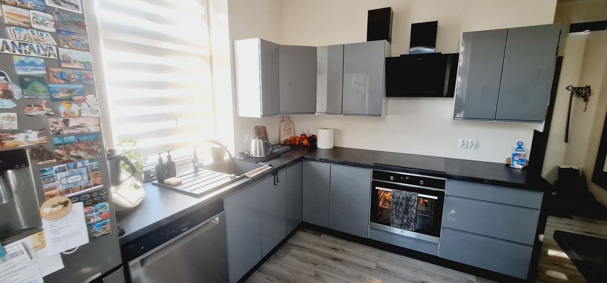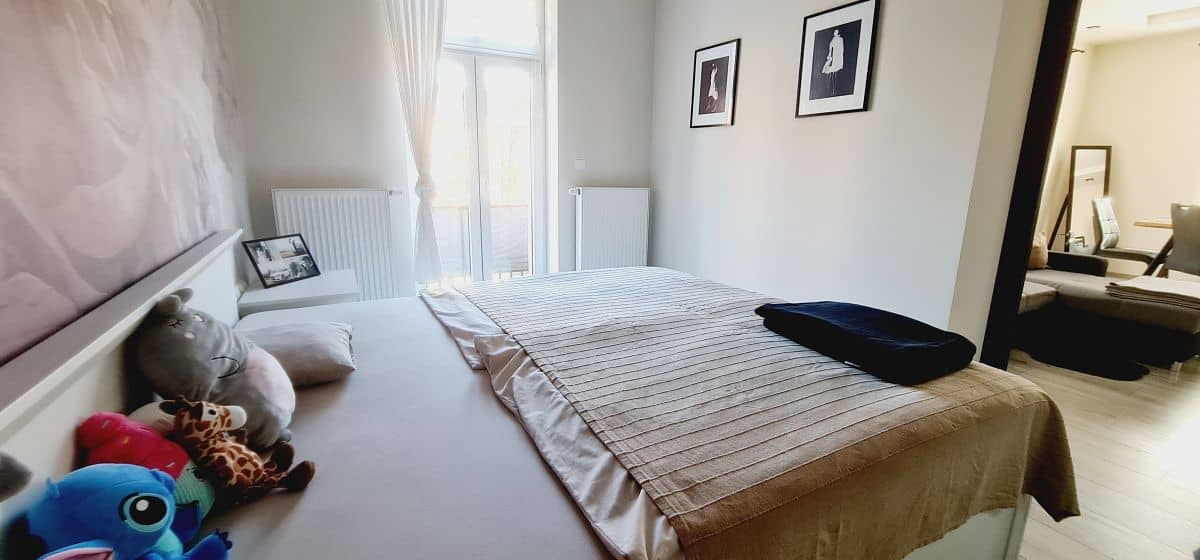 W mieszkaniu znajduje się sypialnia z garderobą, a drzwi do niej są przesuwne, co nadaje wnętrzu nowoczesnego charakteru i pozwala lepiej wykorzystać przestrzeń. Kuchnia została zaprojektowana w funkcjonalny sposób i wyposażona w stylową wyspę, która stanowi zarówno miejsce do przygotowywania posiłków, jak i spotkań przy wspólnym stole. Na wyposażeniu pozostaje większa część mebli i sprzętu AGD.