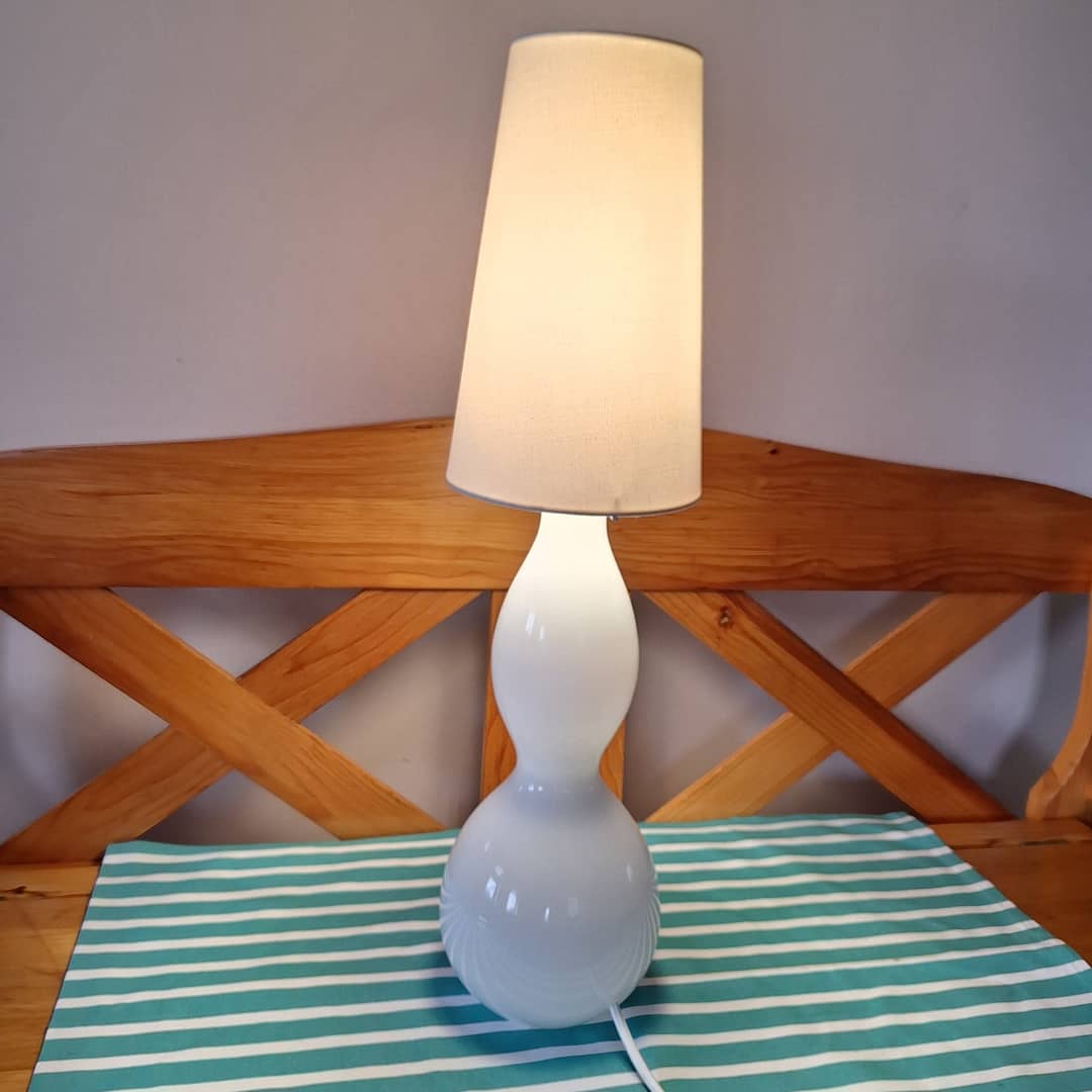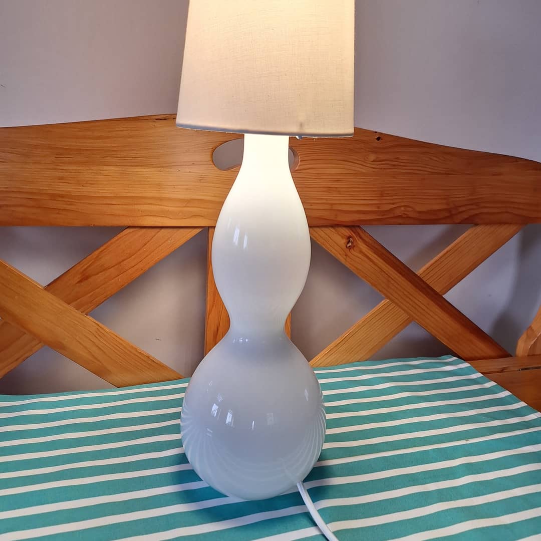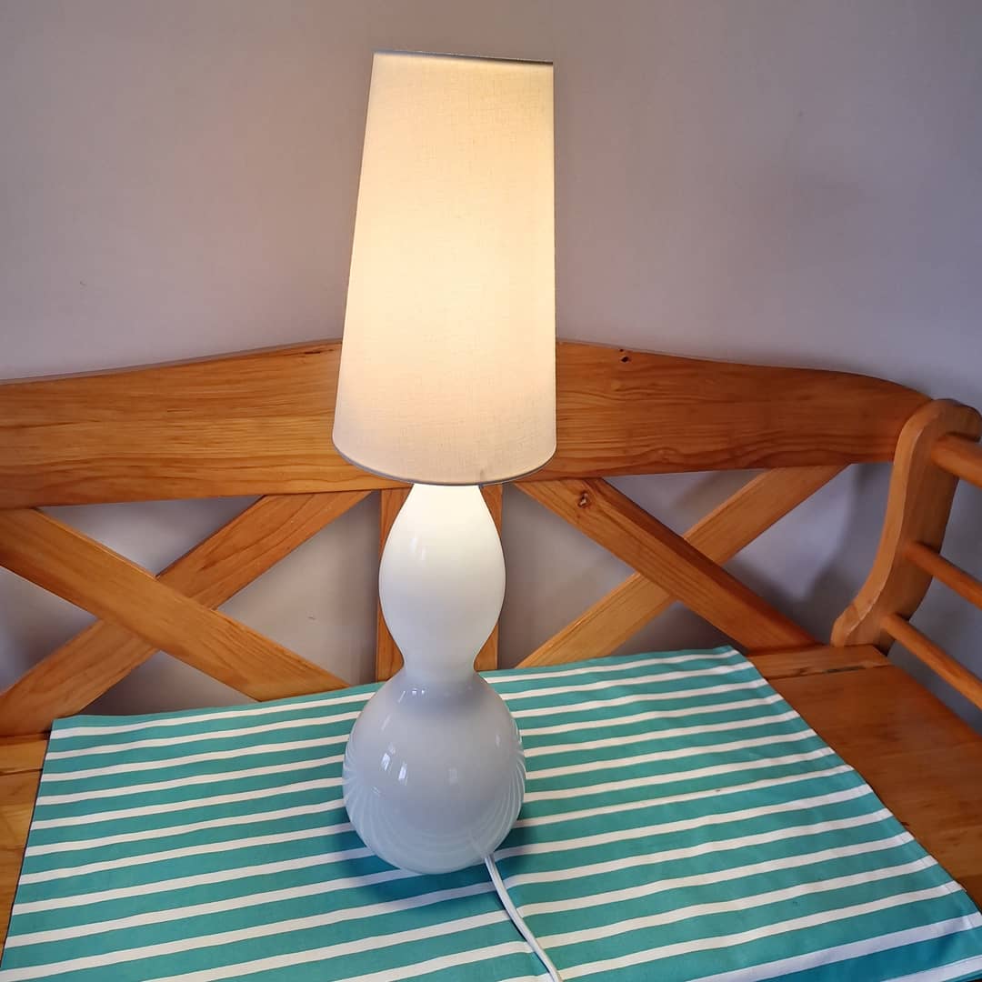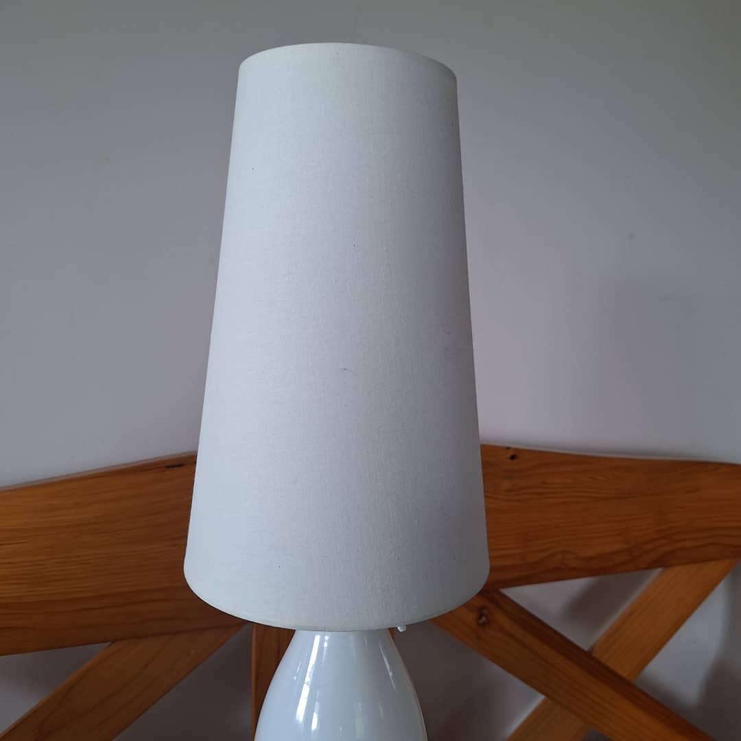 Wysoka szklana lampa stołowa Ljusas Salbo, zaprojektowana przez Anne Nilsson dla Ikea. Abażur materiałowy, wysokość 62 cm, w komplecie nowa żarowka. Długi sznurkowy kabel, włącznik z regulacją światła. Możliwy dowóz lub wysyłka. Cena 120 zł.