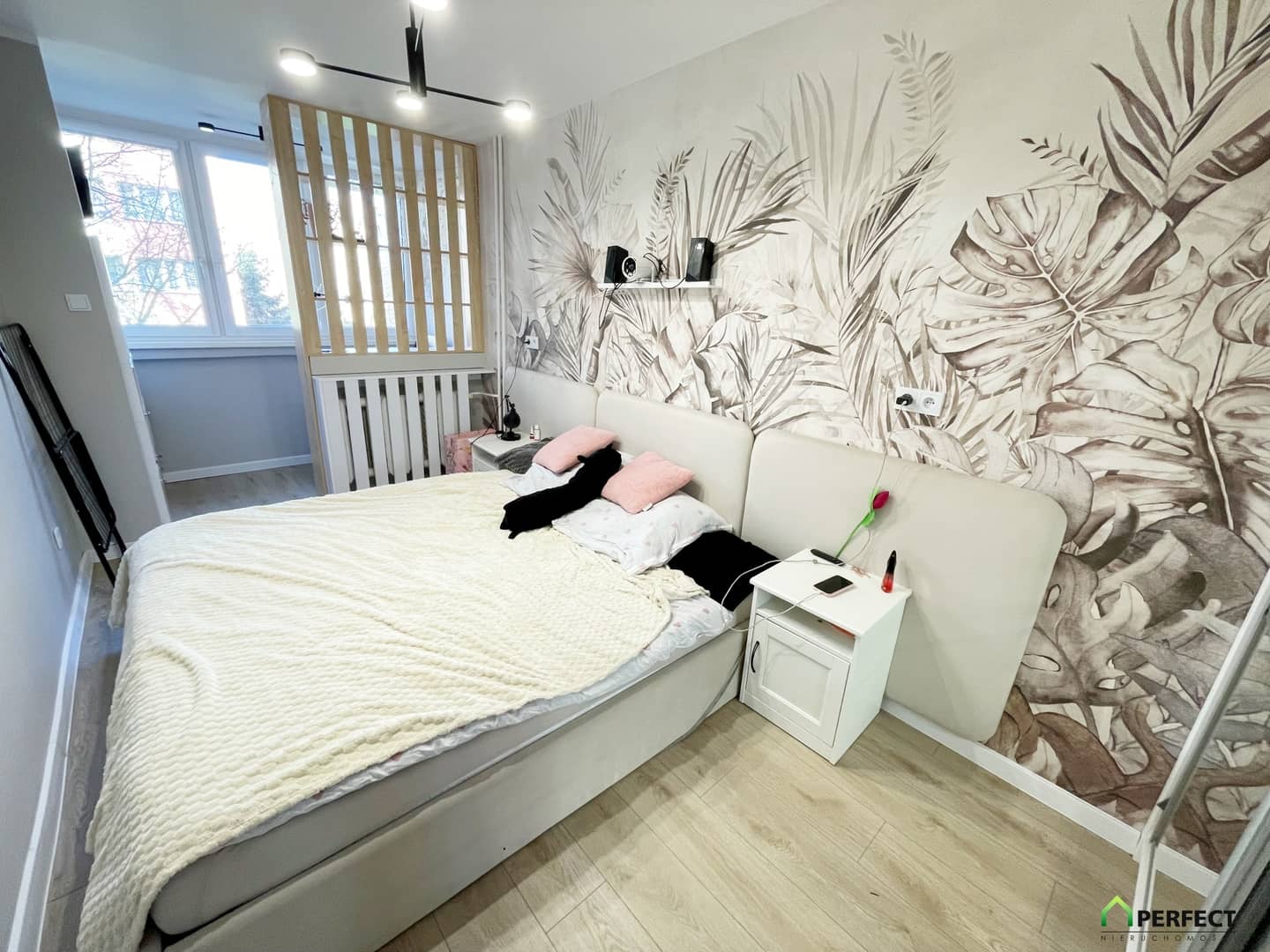 - sypialnia wraz z przepierzeniem oddzielającym pokój od loggii przekształconej na pomieszczenie biurowe