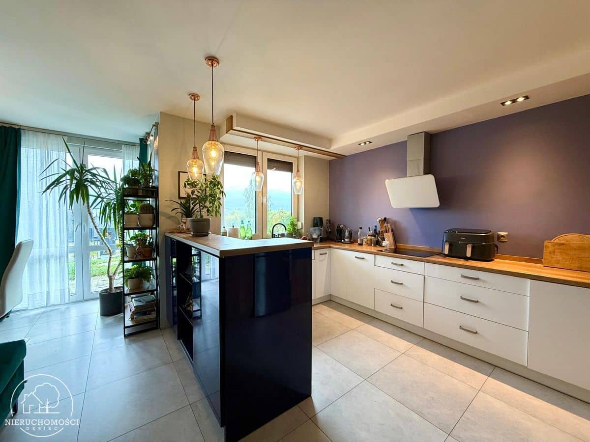 Do lokalu przynależy taras (116 m2) z pięknym widokiem na góry, ogród kaskadowy (461 m2) z prywatnym wyjściem do lasu oraz dwa miejsca parkingowe.