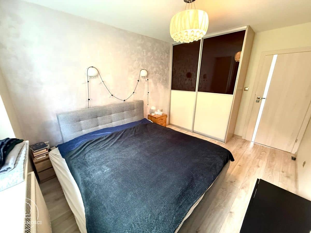 W mieszkaniu pozostaję część wyposażenia widoczna na zdjęciach - w pełni wyposażona kuchnia, szafy w zabudowie, sypialnia.