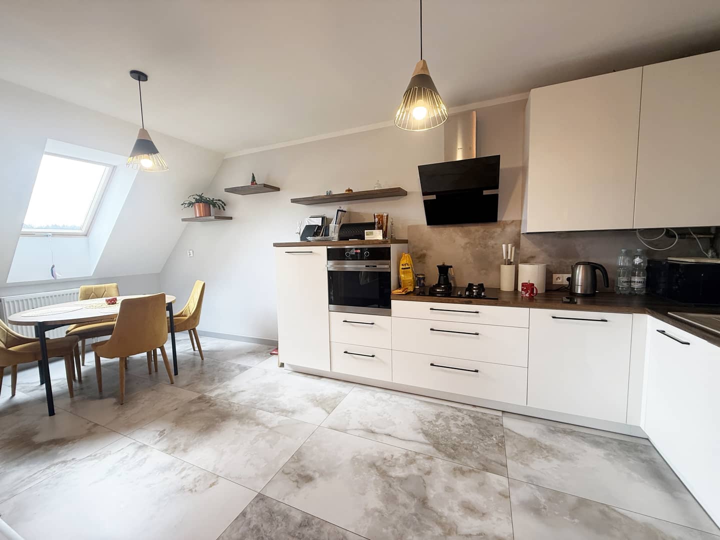 - salon z aneksem kuchennym i wyjściem na balkon;