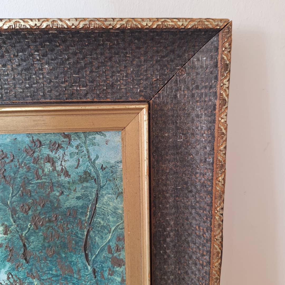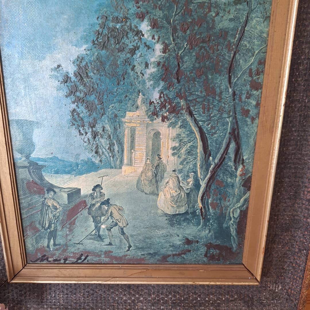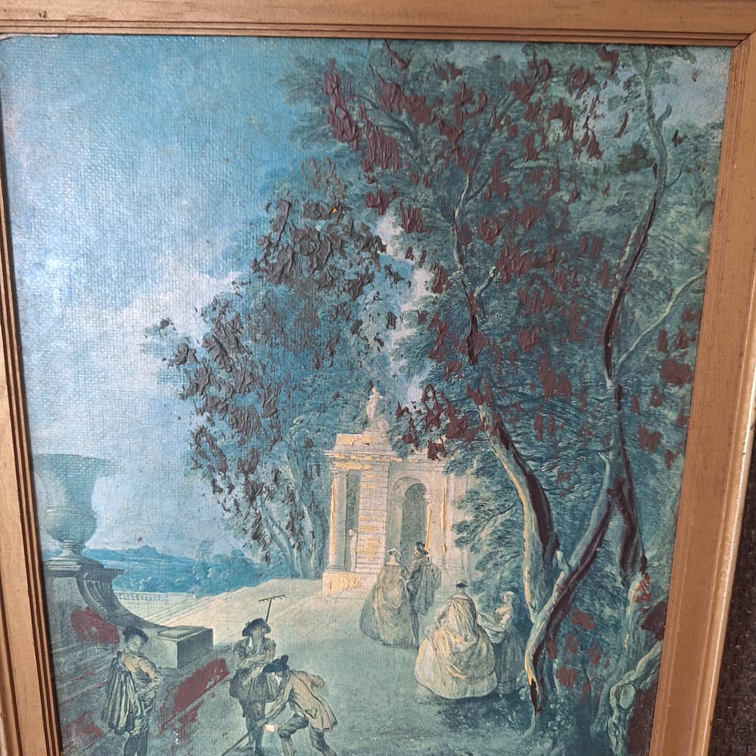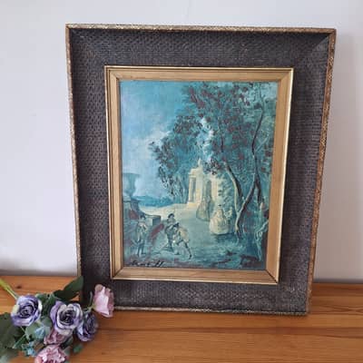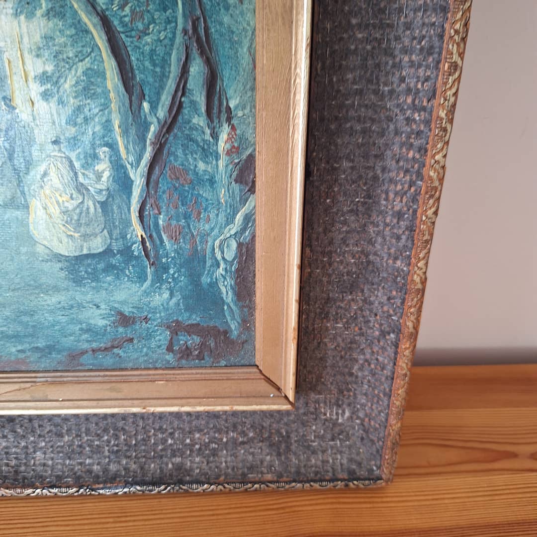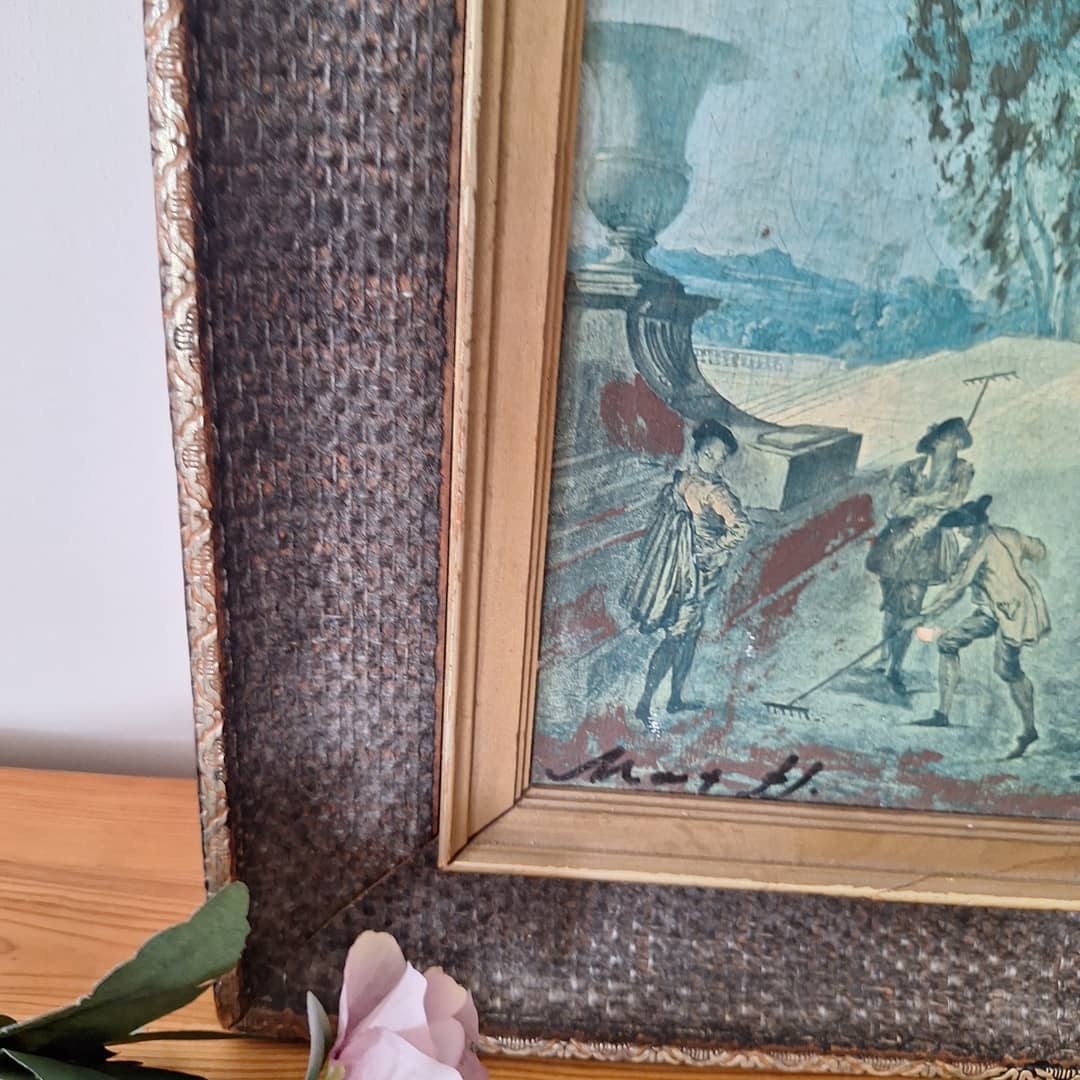 Obrazek druk na płycie, przedstawia scenkę rodzajową w ogrodzie, ludzi w strojach epoki. Oprawiony w drewnianą, ozdobną ramę. Wielkość 38/44 cm. Możliwy dowóz lub wysyłka. Cena 50 zł.