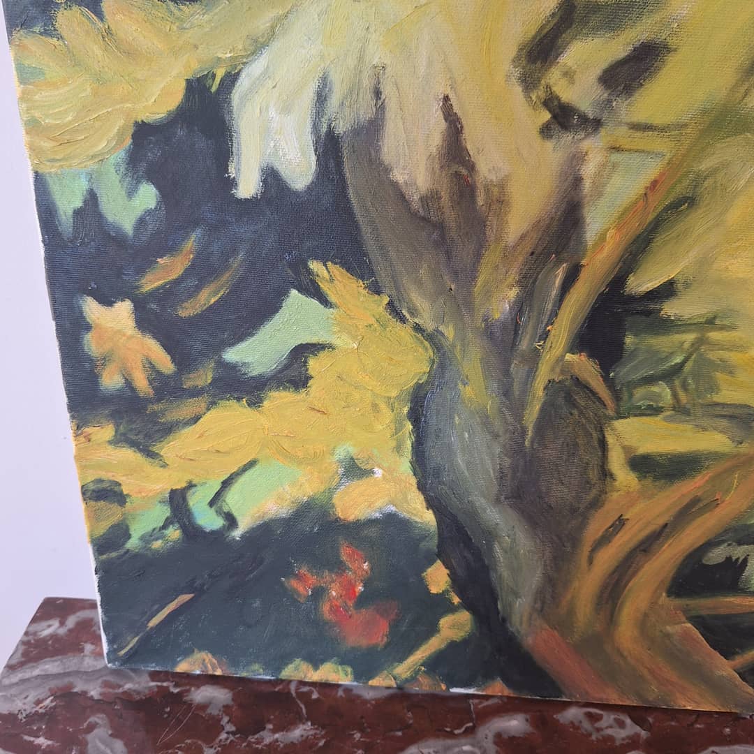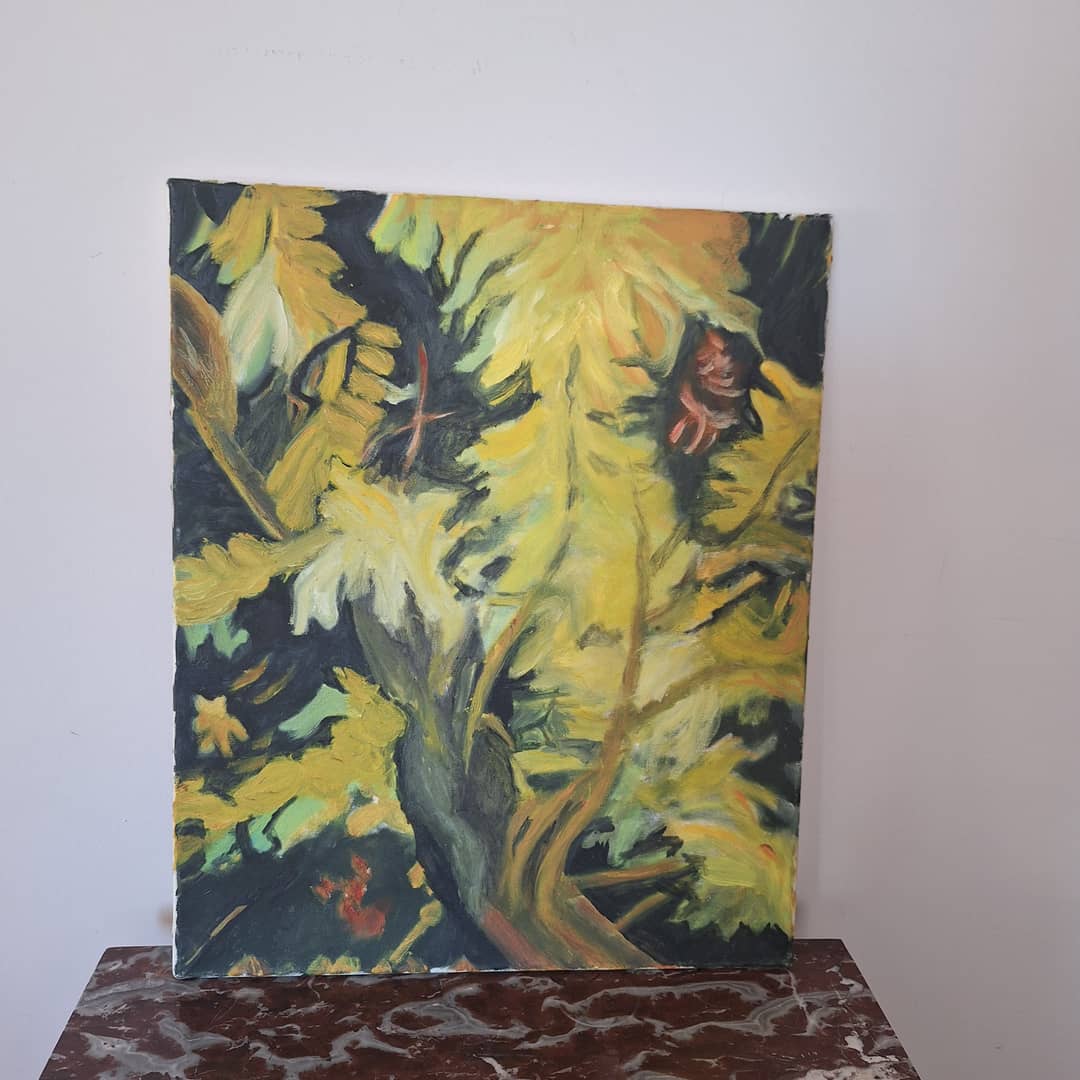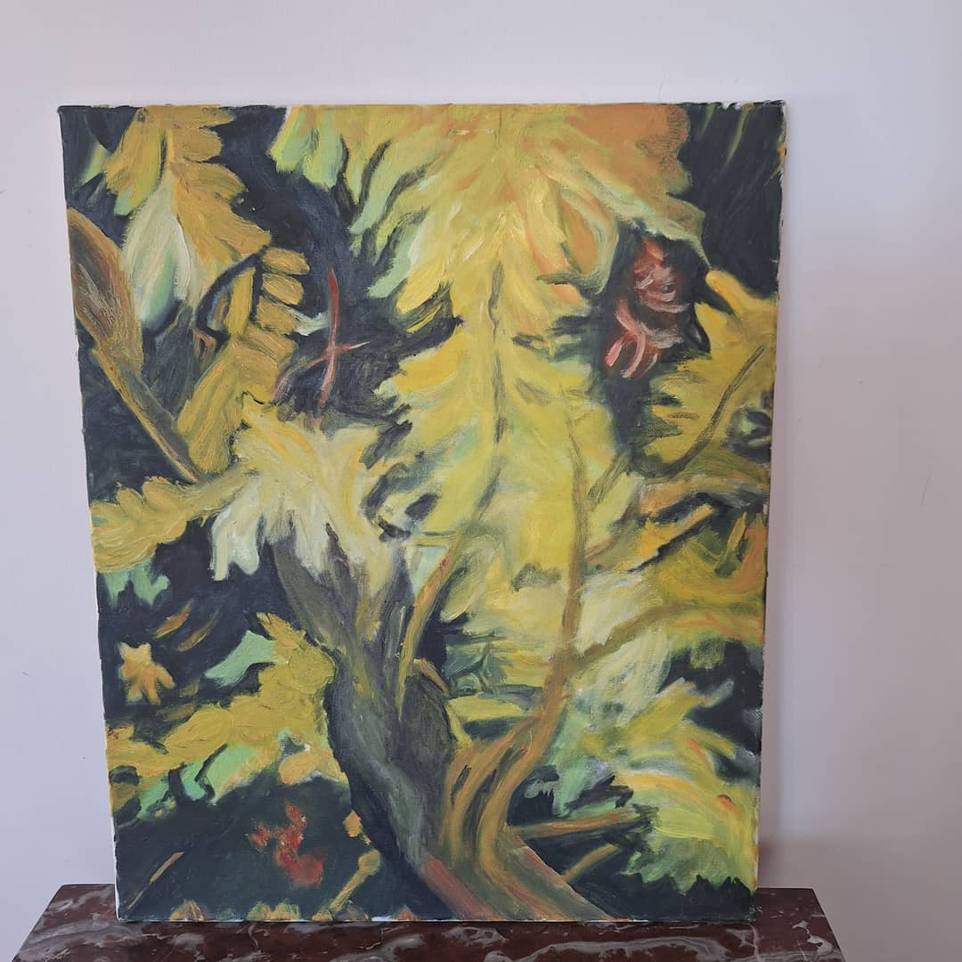 Obraz olejny przedstawiający gałęzie akacji w rozkwicie. Wielkość 50/62 cm, możliwy dowóz lub wysyłka. Cena 60 zł.