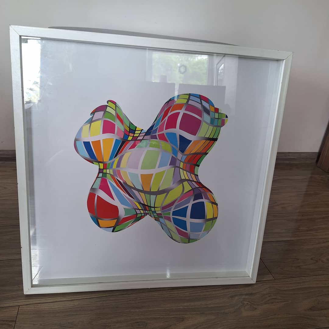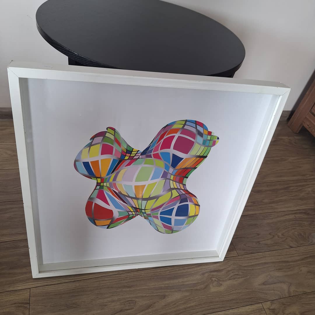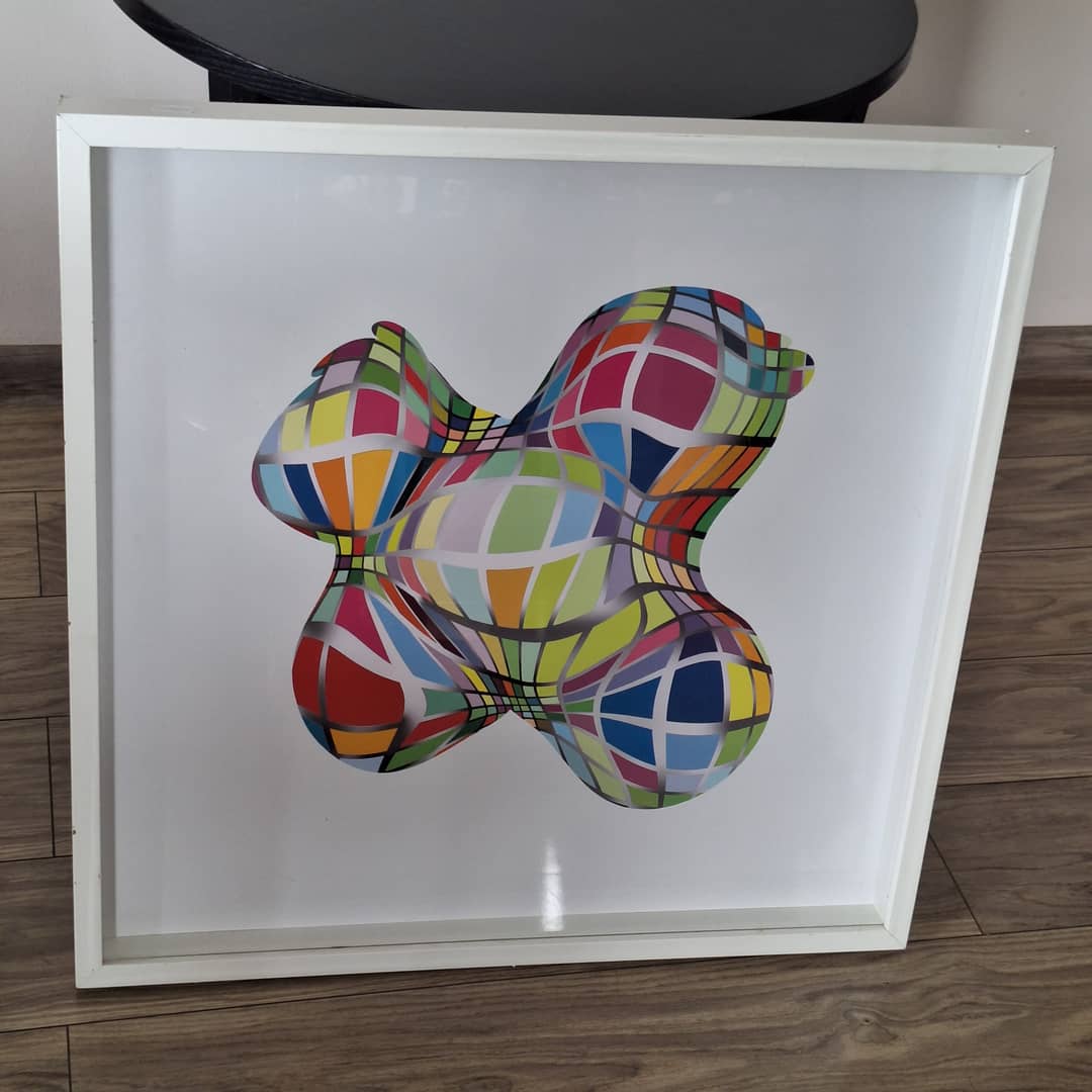 Obraz za szkłem akrylowym ,abstrakcja, obiekt o nieregularnym kształcie. Wymiary 62/62/5 cm. Możliwy dowóz lub odbiór osobisty. Cena 75 zl.
