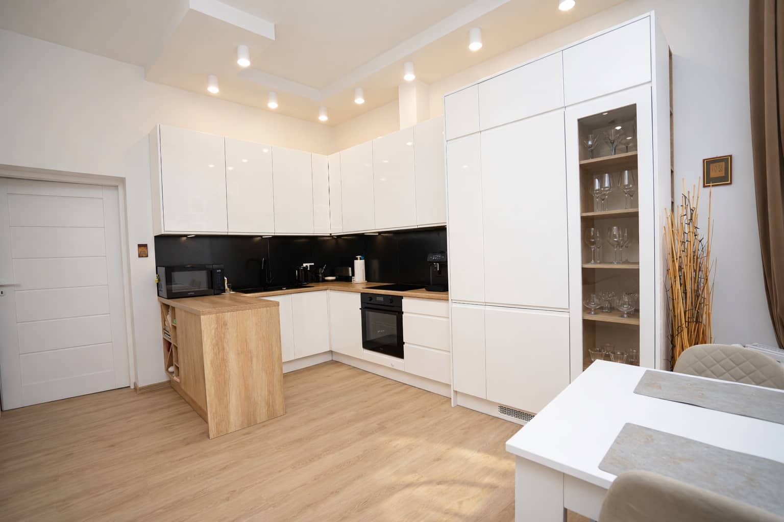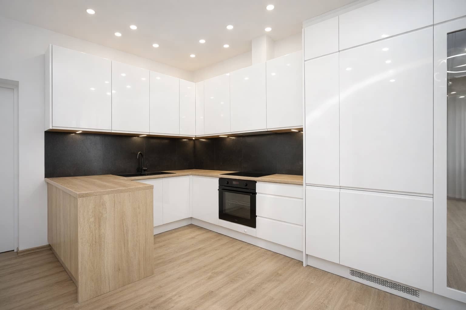 zabudowa kuchni wykonana na wymiar wraz ze sprzętem AGD (lodówka, zamrażarka, płyta indukcyjna, piekarnik, zmywarka)