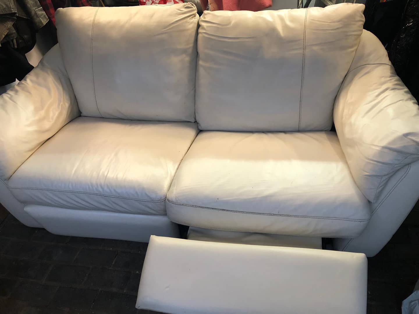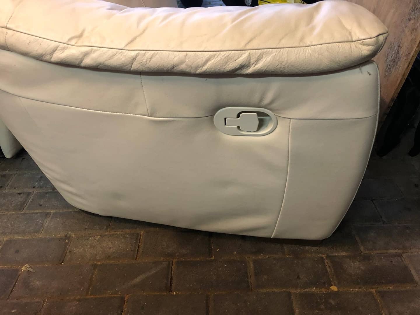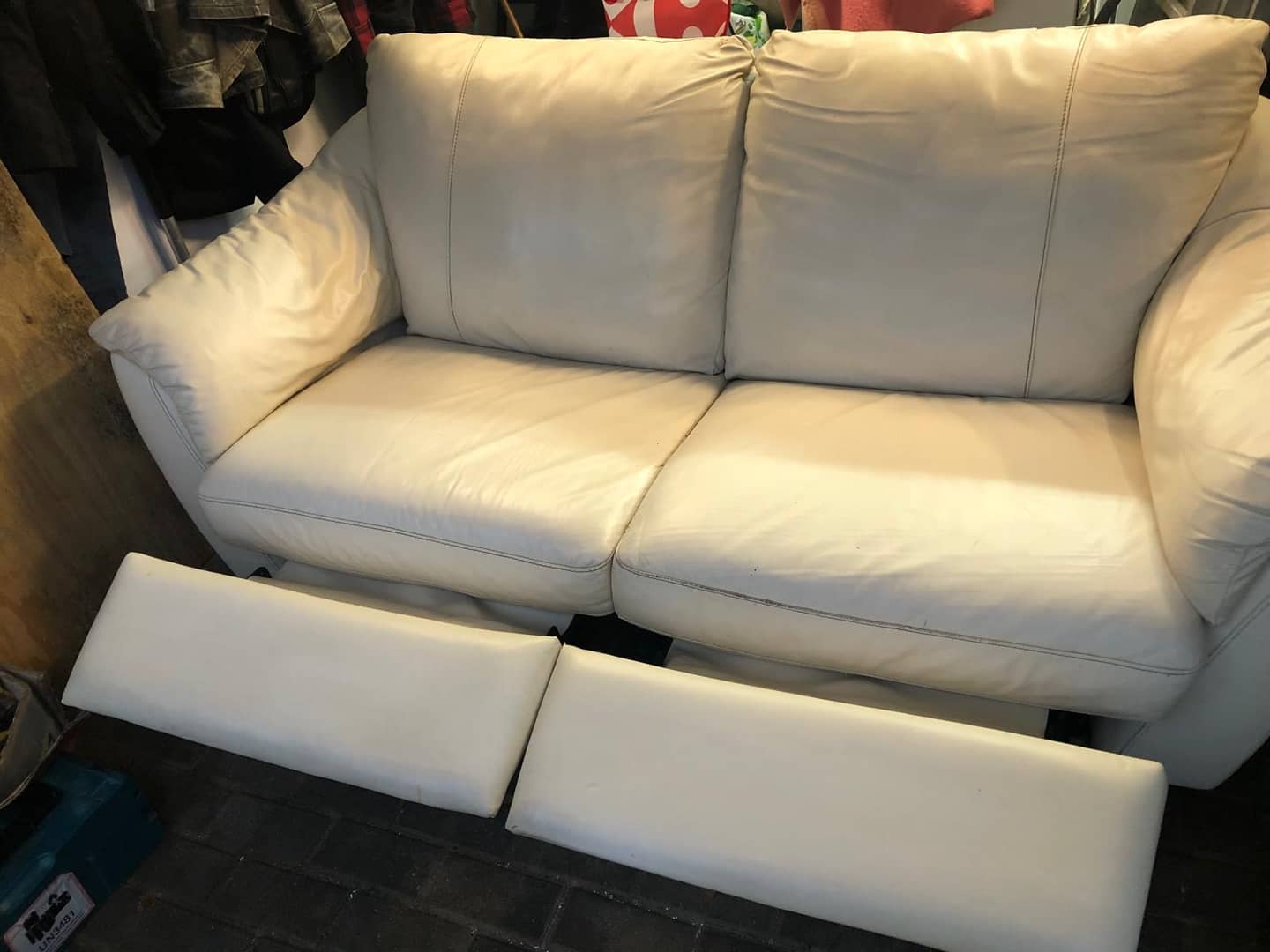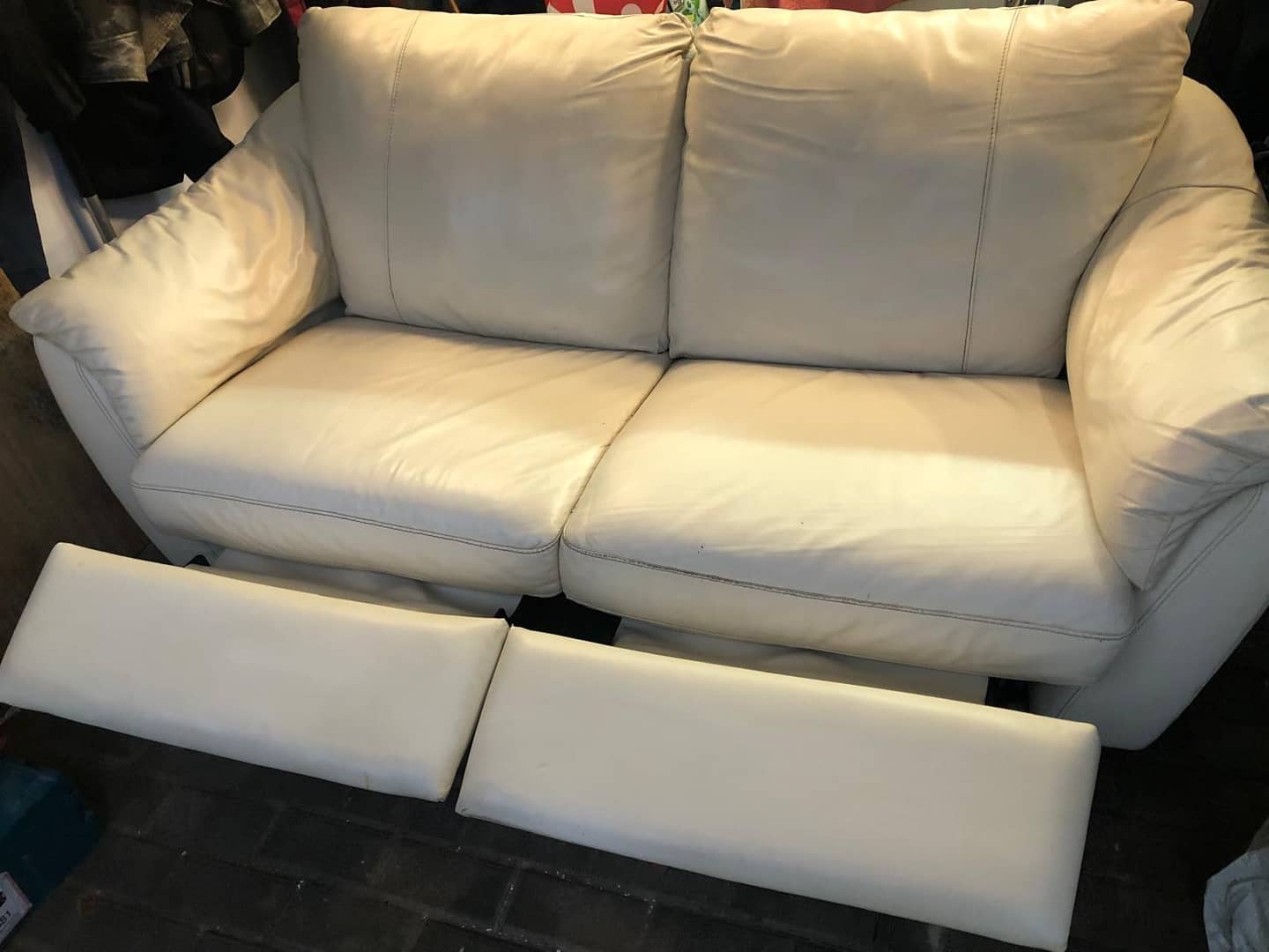 Wygodna, skórzana sofa z funkcją relaksu, fotele rozkładane z wysuwanym podnóżkiem. Mebel wykonany ze skóry naturalnej lakierowanej (to nie materiał skóropodobny, skaj). Kanapa jest w stanie używanym, ale nadal zapewnia komfort i relaks. Idealna do salonu lub pokoju wypoczynkowego. Sofa posiada widoczne ślady użytkowania w postaci niewielkich przytarć na skórze. System relax mechaniczny, tył tapicerowany, sofa nie musi być ustawiona tyłem do ściany. . Wymiary: szer. 193 cm, wys. 88 cm, gł. 90 cm. Możliwy transport za dodatkową opłatą. Polecam