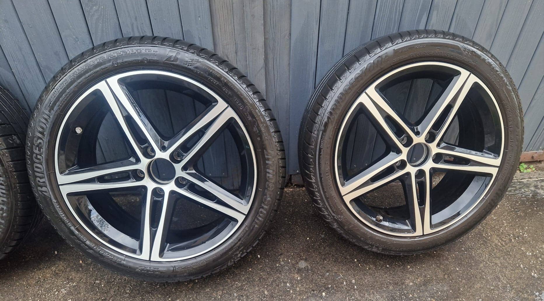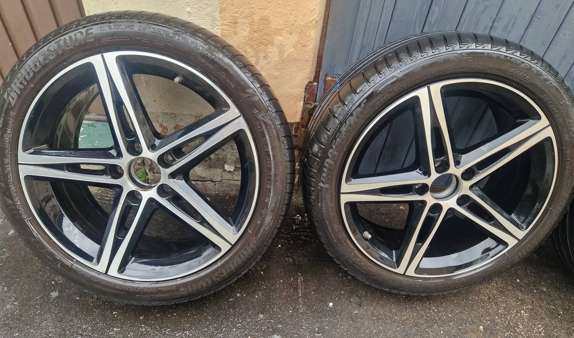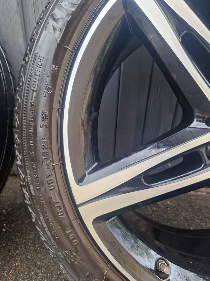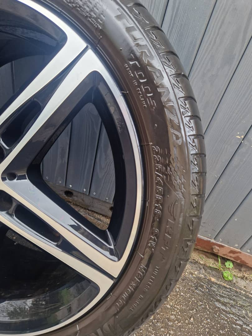 Sprzedam bardzo ładne alufelgi Mercedes z oponami Bridgestone 225/45/R18 91W; cały komplet jeździł na Mercedes CLA 2021; Alu nie spawane; nie prostowane z czujnikami ciśnienia MB; opony z 2021 r z bieżnikiem około 4-4,5 mm; cena za komplet 3000 zł