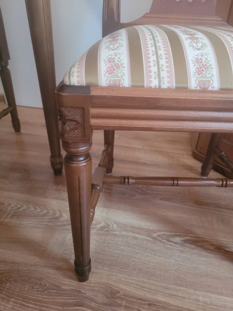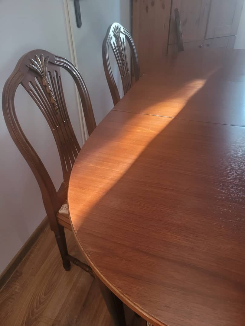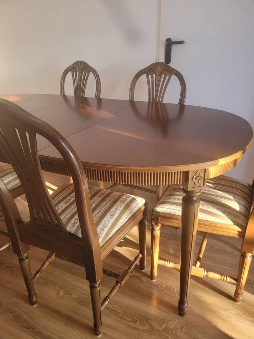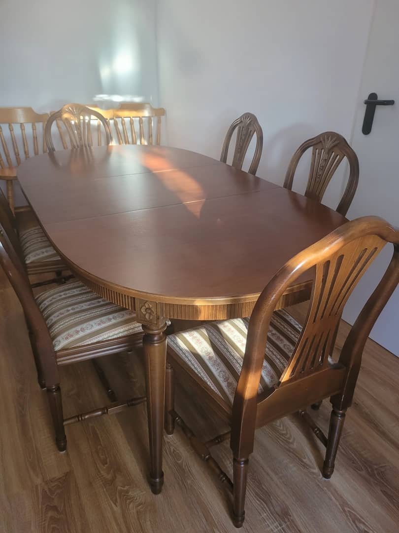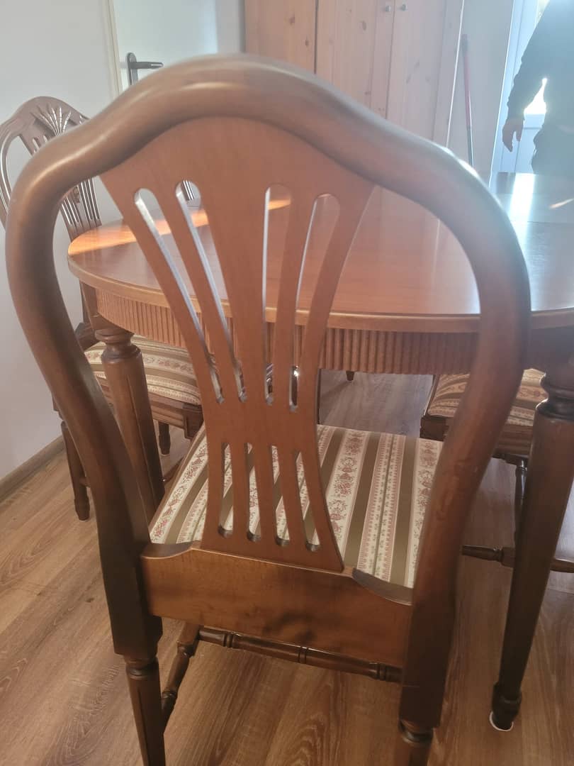 Piękny komplet stół i 6 krzeseł, owalny, drewniany, rozkładany 2 wstawkami. Przed rozłożeniem ma 140 cm, z jedną wstawką 190 cm, z dwiema 240 cm. Bez wad i uszczerbień, krzesła mają piękne obicia, czyste, nie rozchwiane, wygodne. Możliwy transport, cena za komplet 2000 zł.
