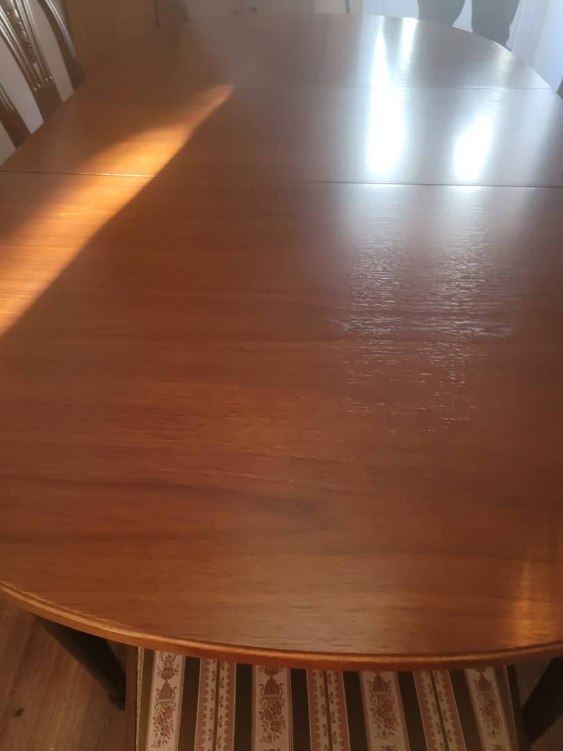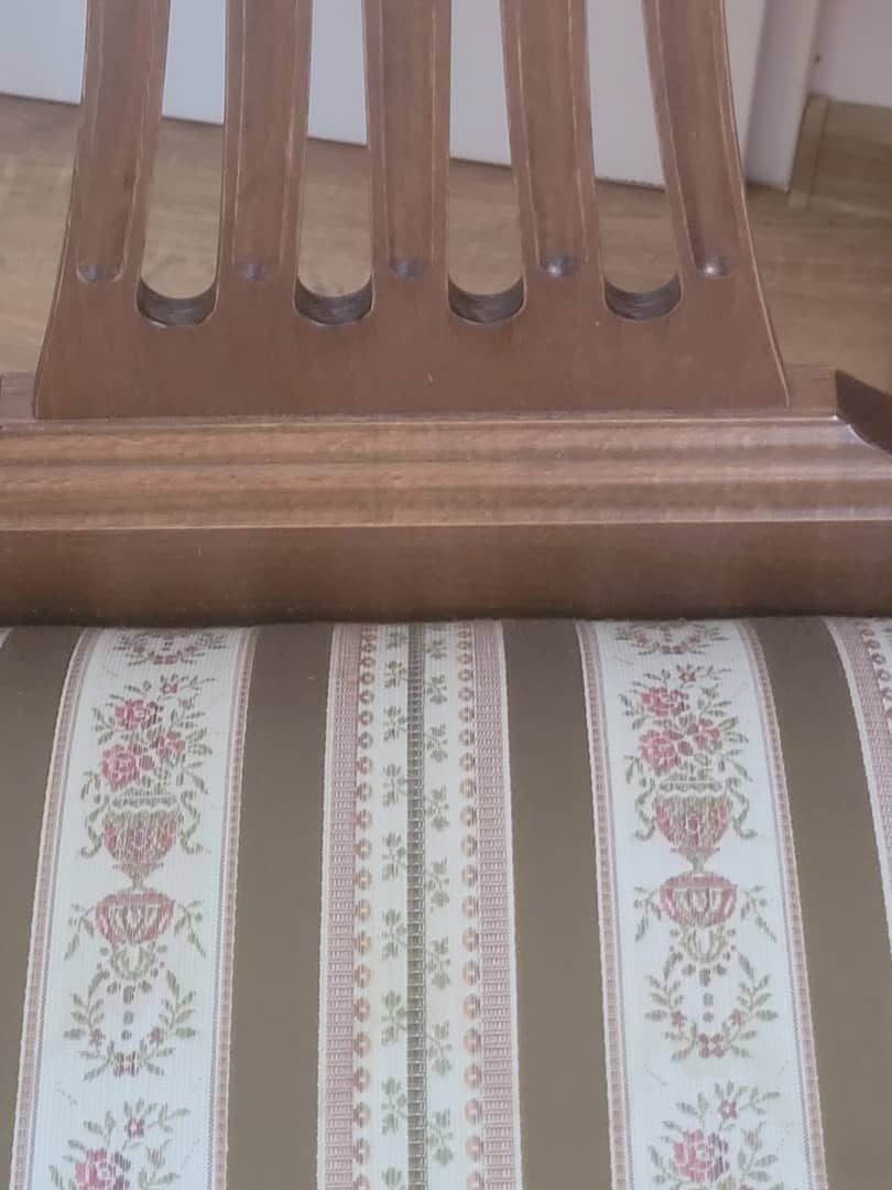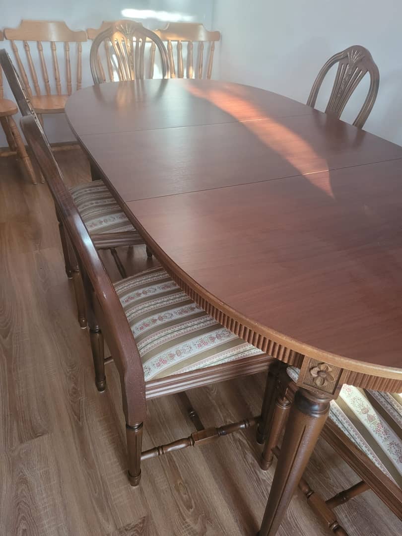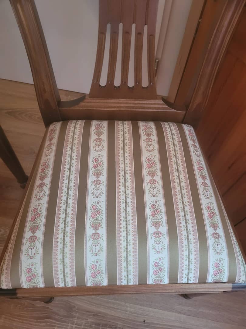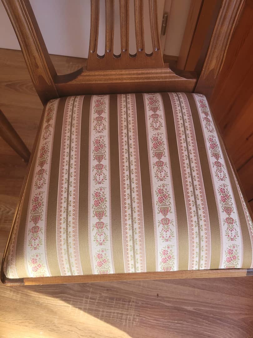 Piękny komplet stół i 6 krzeseł, owalny, drewniany, rozkładany 2 wstawkami. Przed rozłożeniem ma 140 cm, z jedną wstawką 190 cm, z dwiema 240 cm. Bez wad i uszczerbień, krzesła mają piękne obicia, czyste, nie rozchwiane, wygodne. Możliwy transport, cena za komplet 2000 zł.