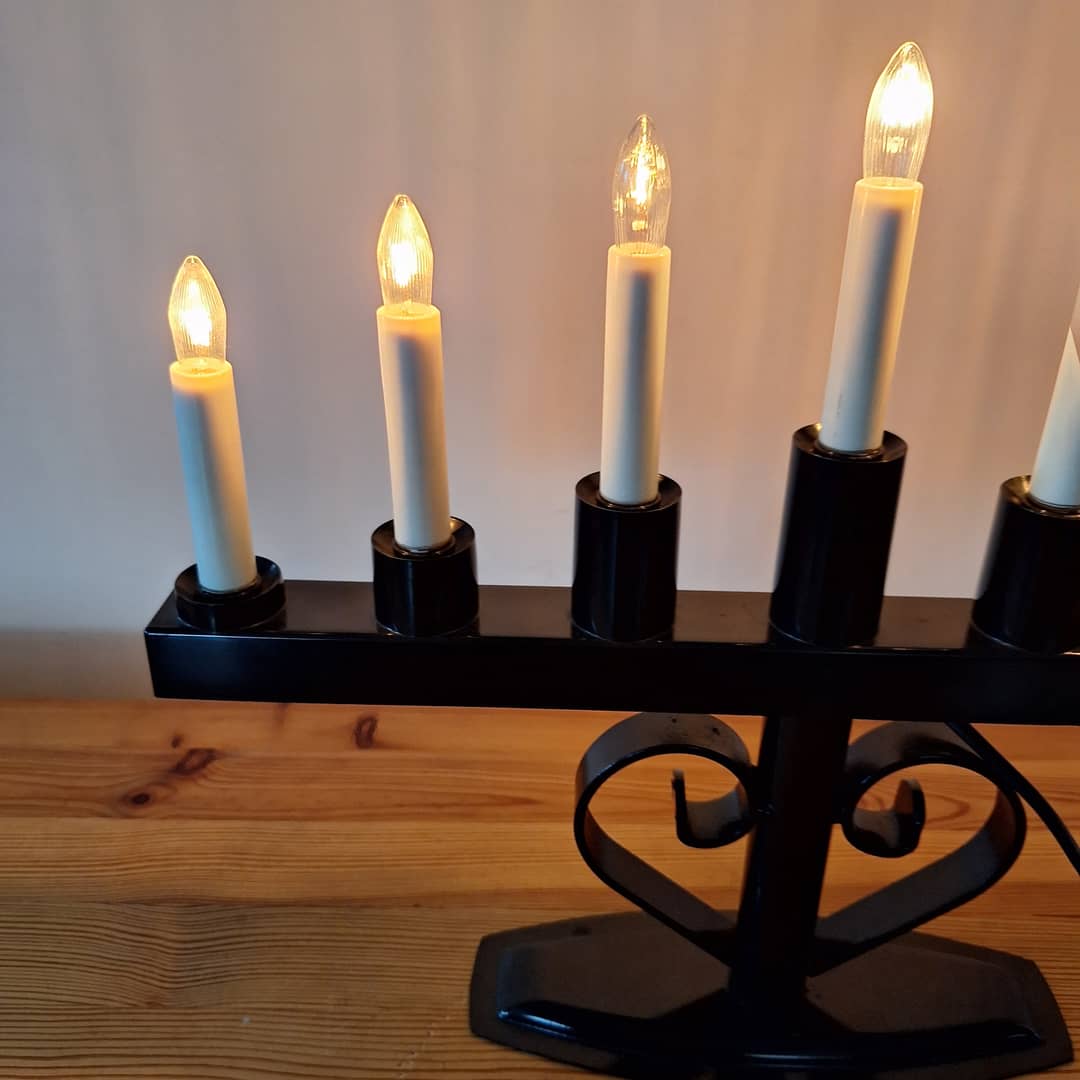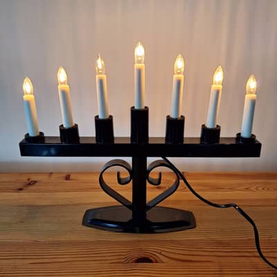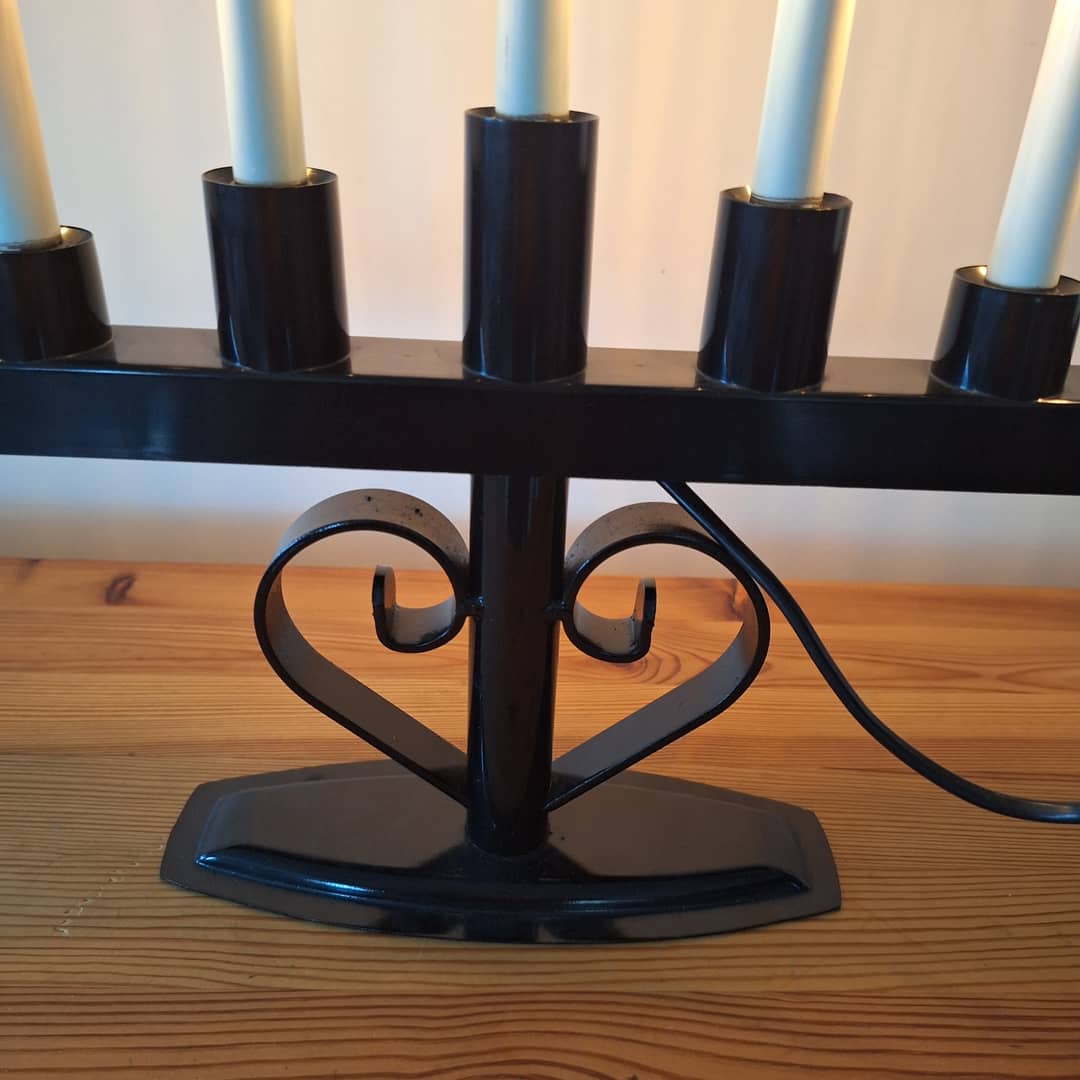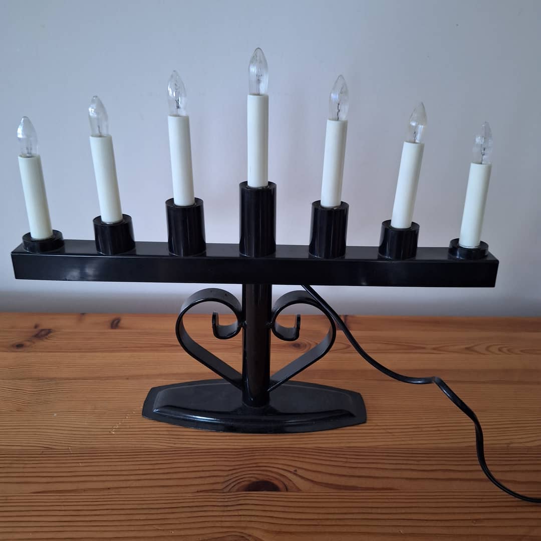 Świecznik adwentowy czarny, ozdobny, na 7 żarówek. Długość 36 cm, wysokość 43 cm. Możliwy dowóz lub wysyłka. Cena 80 zł.