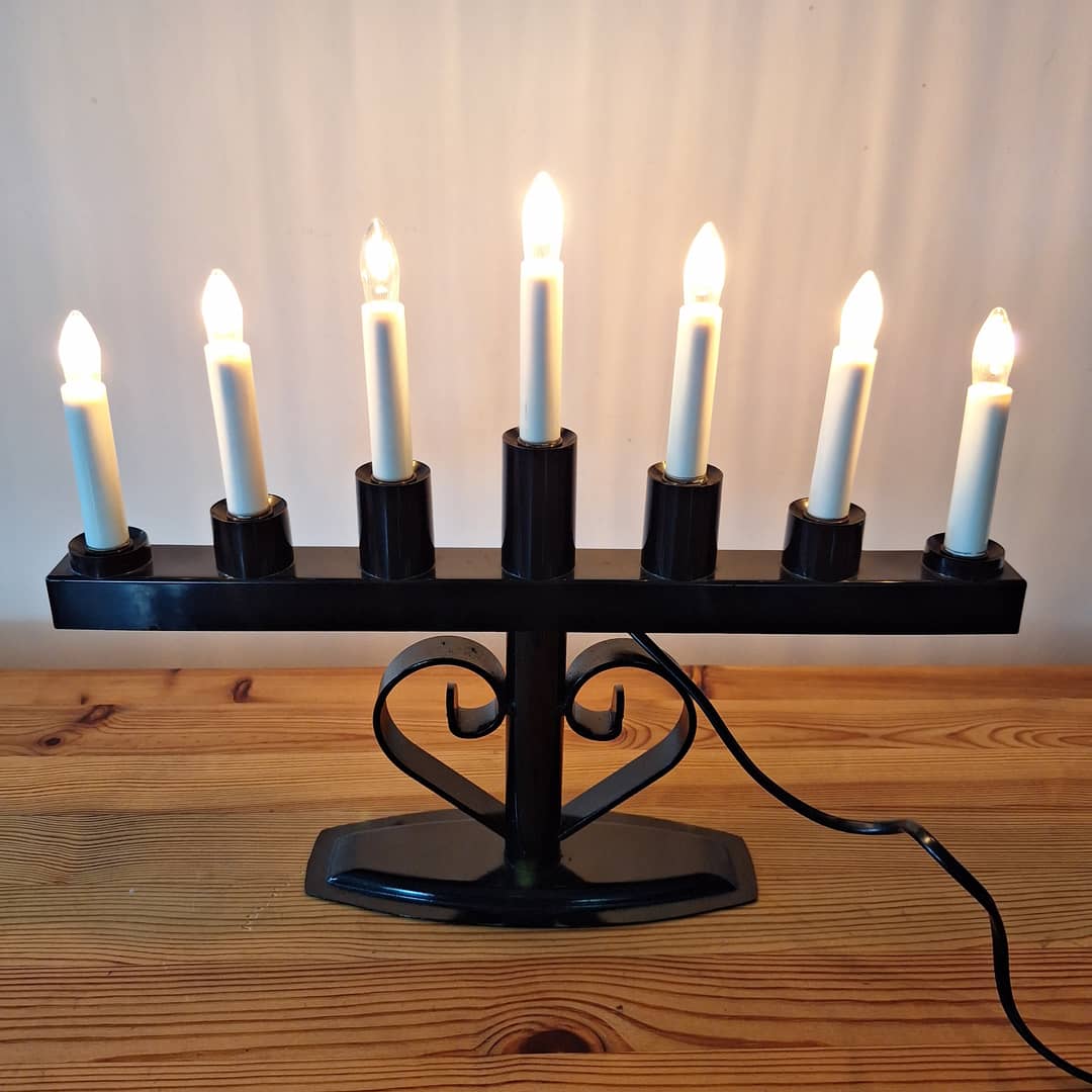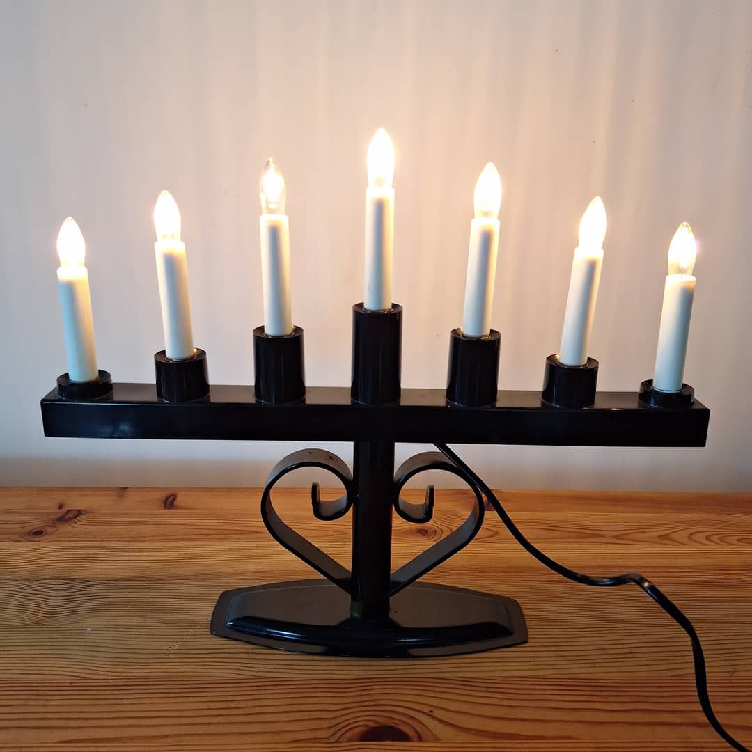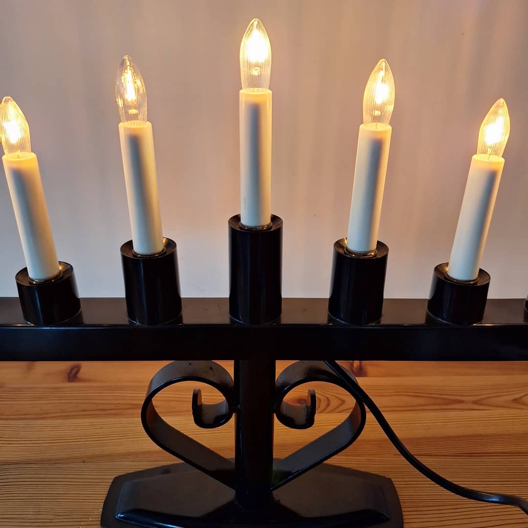 Świecznik adwentowy czarny, ozdobny, na 7 żarówek. Długość 36 cm, wysokość 43 cm. Możliwy dowóz lub wysyłka. Cena 80 zł.