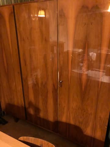 drewniana, trzydrzwiowa, wysoki połysk, jedna część z półkami, dwie części ubraniowe, wymiary: szer. 165 x wysokość 185 x głębokość 65 cm, stan bardzo dobry, możliwość demontażu do odbioru i transportu w częściach, cena do uzgodnienia, wystawiam fakturę VAT, cena 615 zł, tel. 607 100 870; mail: biuro_r@wp.pl