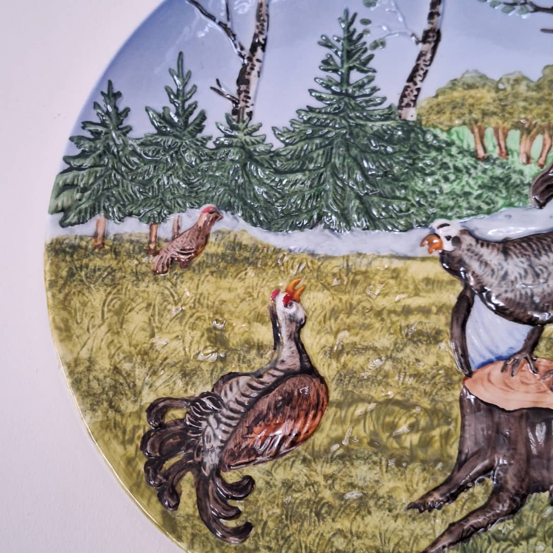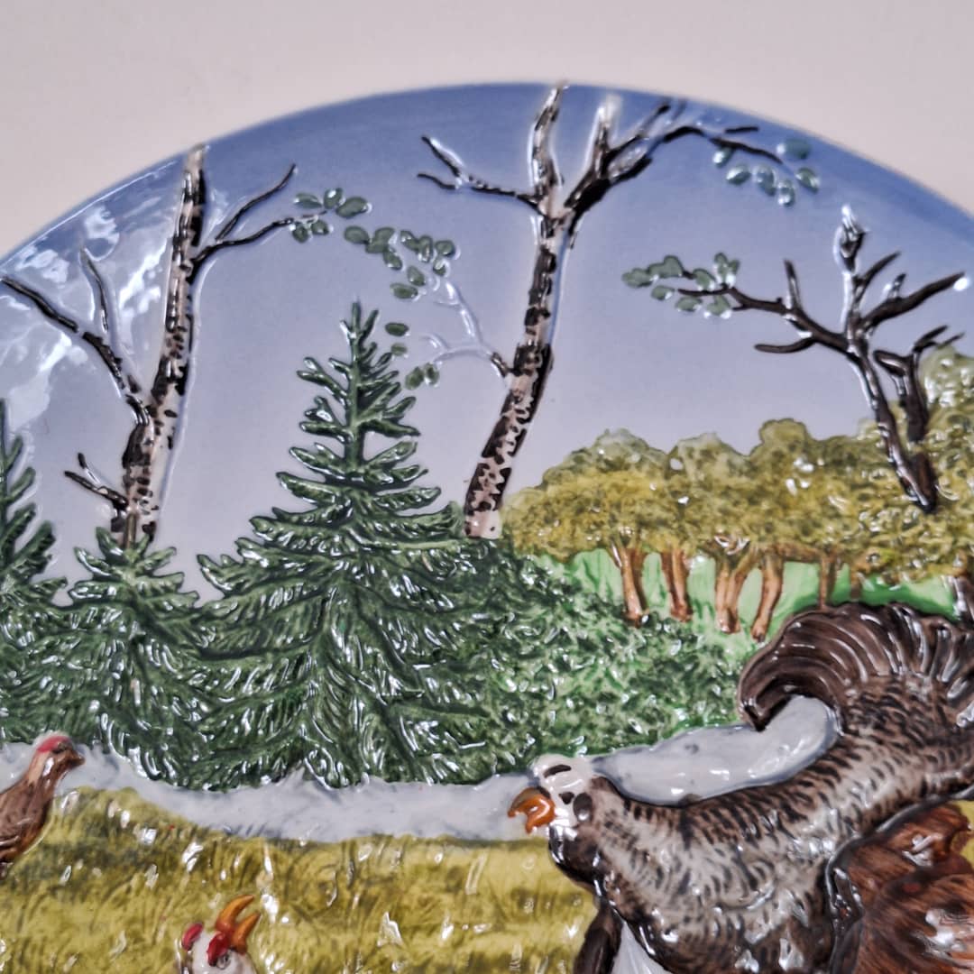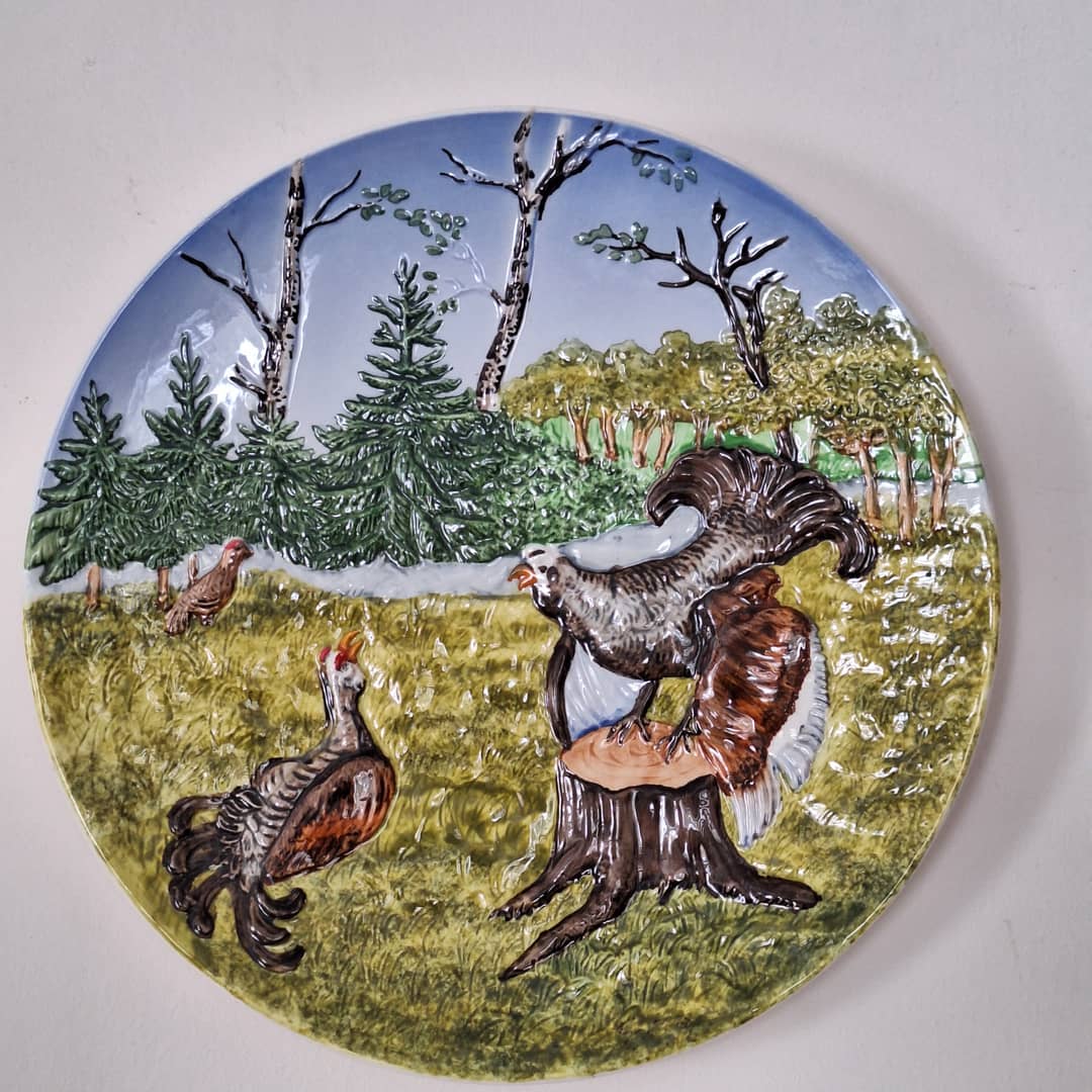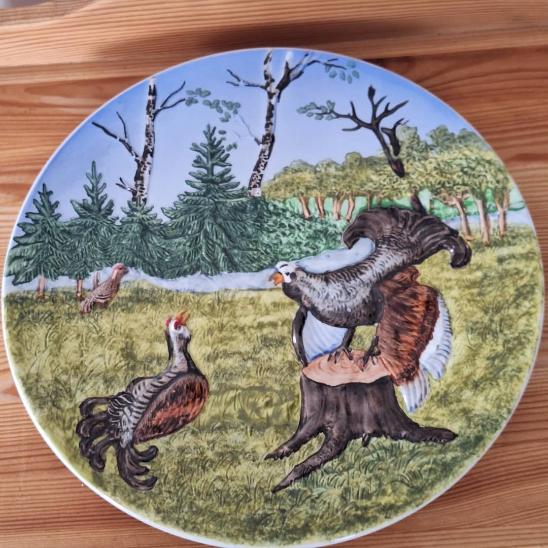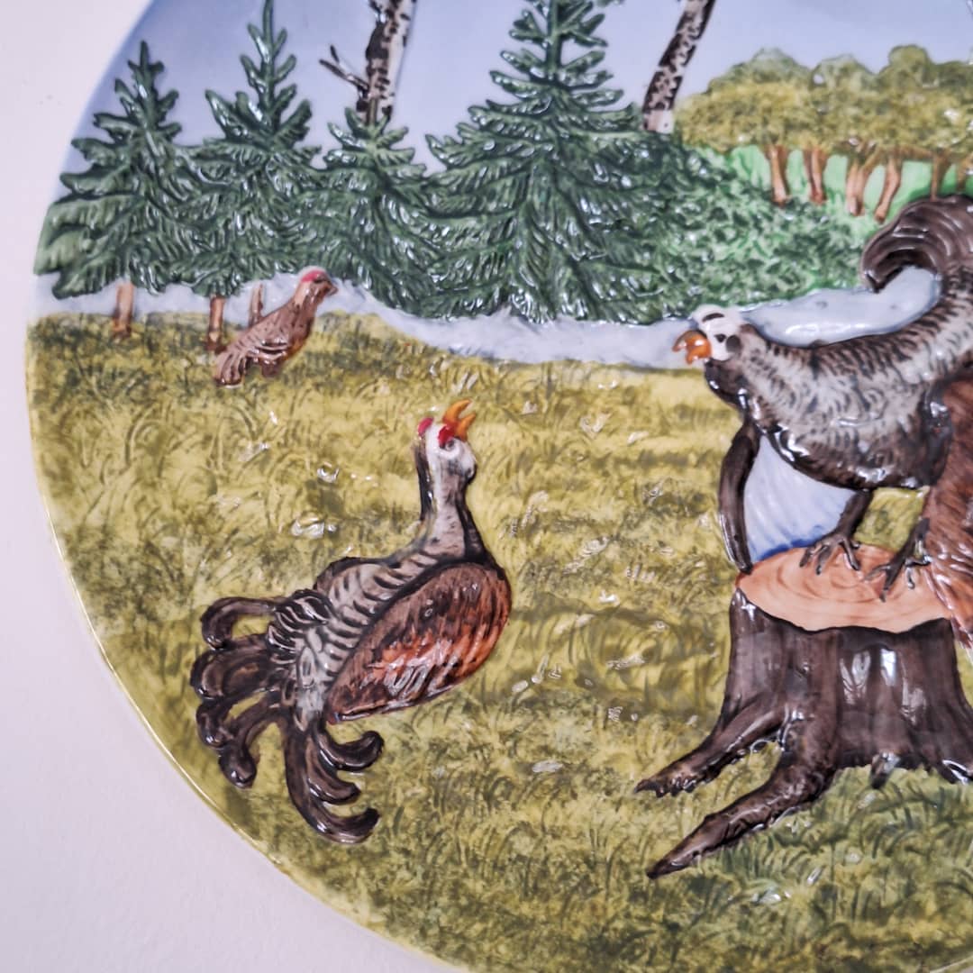 Ceramiczny, ścienny talerz kolekcjonerski z motywem cietrzewia. Przedstawia scenkę myśliwska i ma refeliowy wzór. Motyw jest kolorowany ręcznie. Średnica 31 cm, sygnowany Majolica. Możliwy dowóz lub wysyłka. Cena 170 zł.
