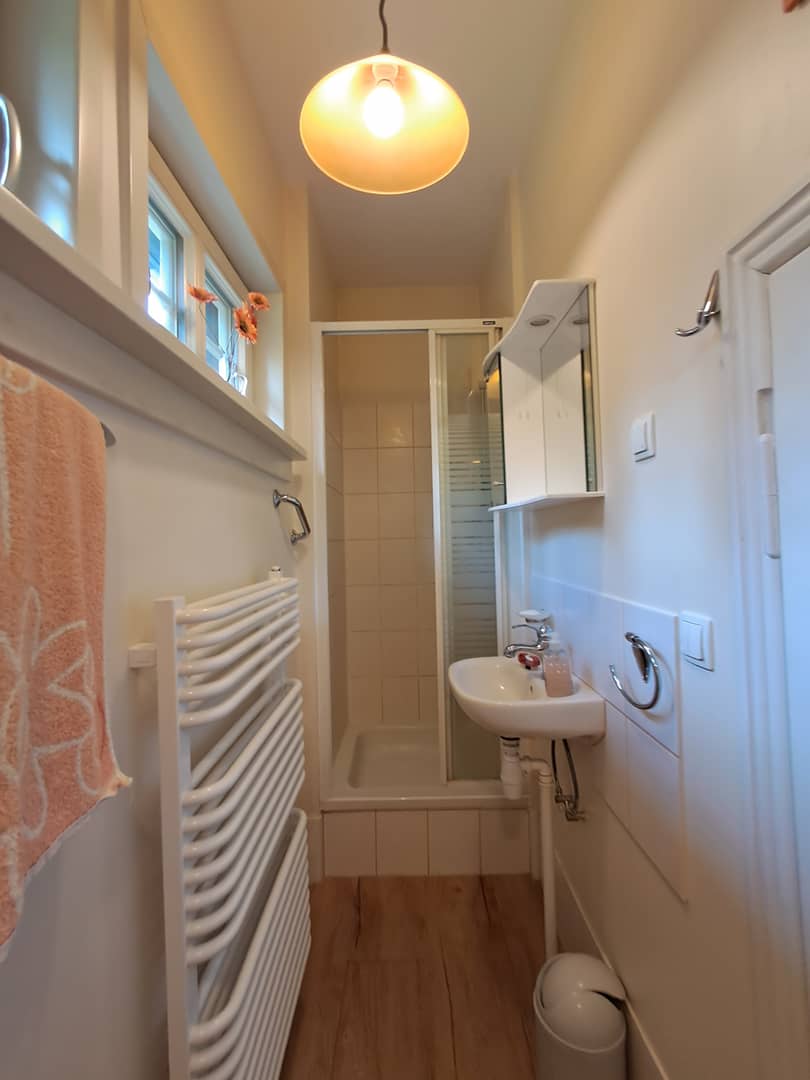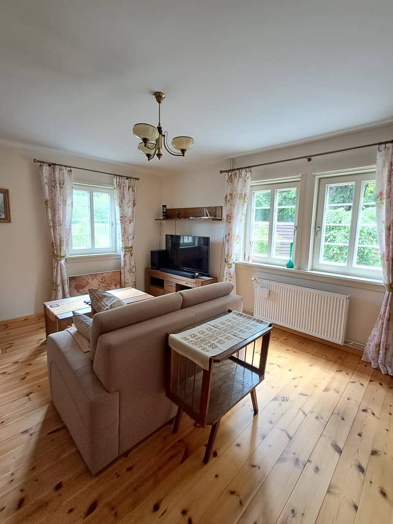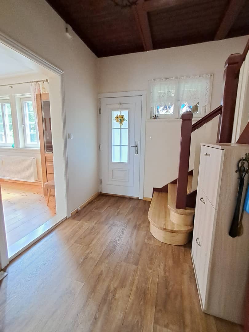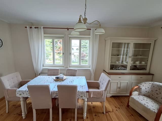 Na parterze znajdują się z dwa pokoje, kuchnia z zachowanym pięknym czynnym piecem kaflowym, łazienka z oknem, weranda i przedpokój.