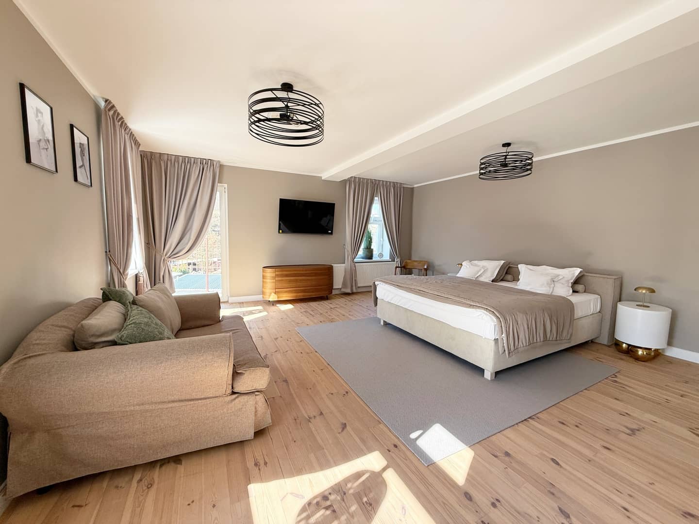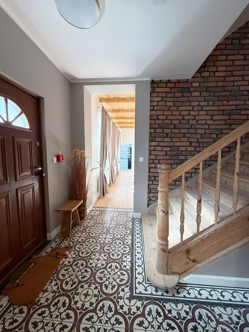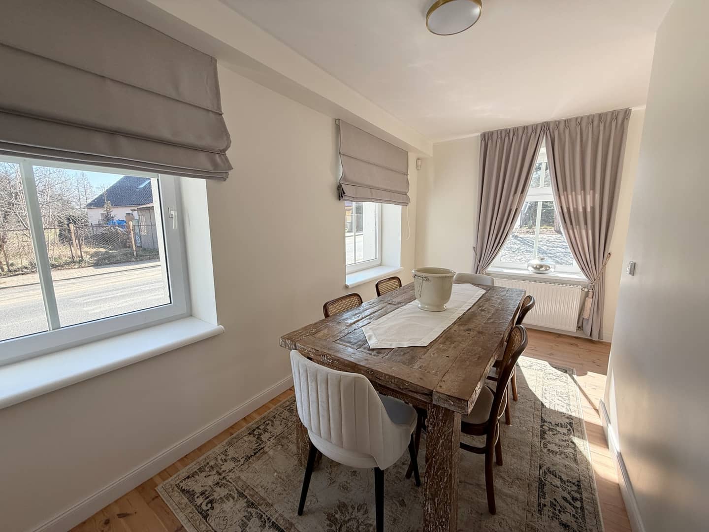 Dzięki dużej ilości okien do domu wpada mnóstwo światła, drewno daje ogrom ciepła, wygodne meble oraz dodatki nadają wnętrzu przytulnego charakteru. Jest to zdecydowanie nieruchomość, w której czuć dobrą energię i spokój.