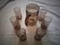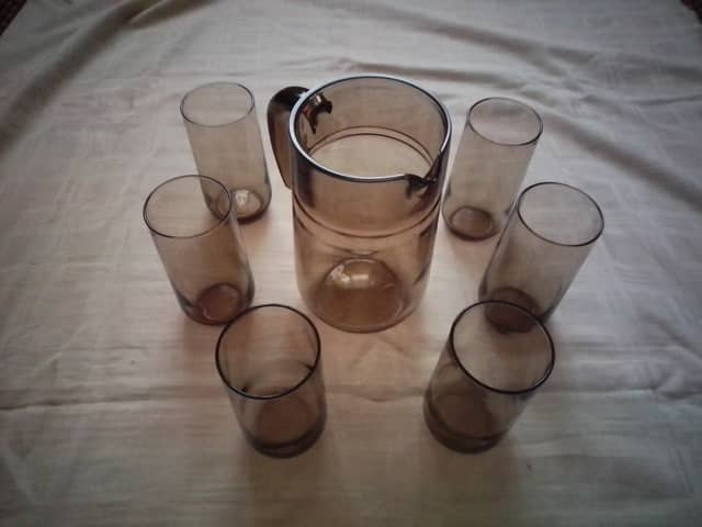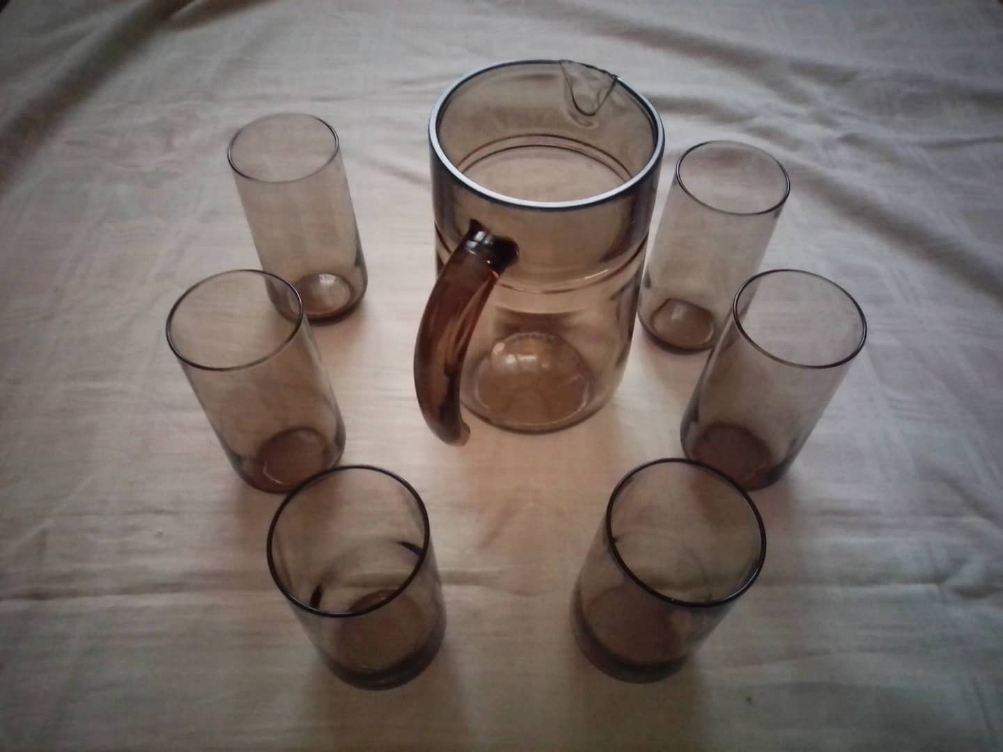 Zestaw do napojów itp. Składa się z dzbanka i sześciu szklanek. Wykonane ze szkła dymnego w odcieniu brązu. Niewielkie oznaki użytkowania. Bez uszczerbków. 30 zł.
