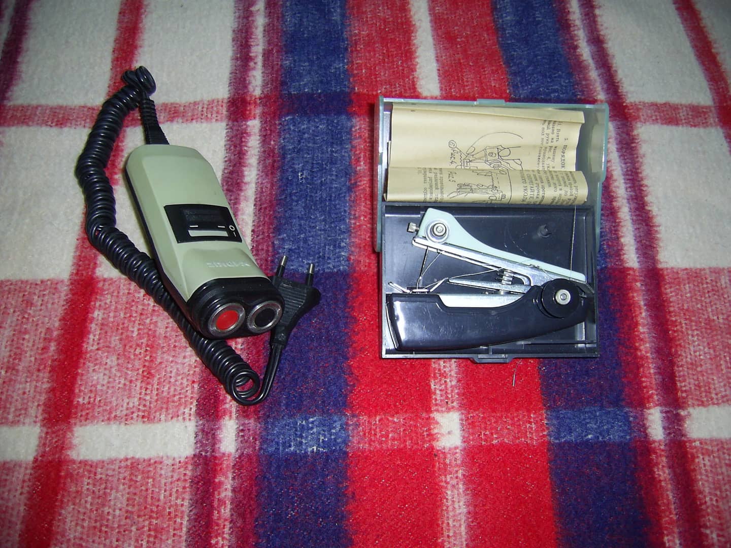 Sprzedam zestaw maszynek produkcji radzieckiej. W zestawie ręczna maszyna do szycia. Produkcja z początku lat 90. Sprawna. Instrukcja obsługi w języku rosyjskim (pudełko jak i maszyna noszą niewielkie ślady użytkowania) oraz maszynka do golenia (trudno odczytać nazwę i model). Nosi ślady użytkowania. Włącza się ale podczas pracy słychać w silniczku piszczenie. Nie przycina zarostu. Wysuwany trymer sprawny (przycina). Przewód zasilający w komplecie. 35 zł.